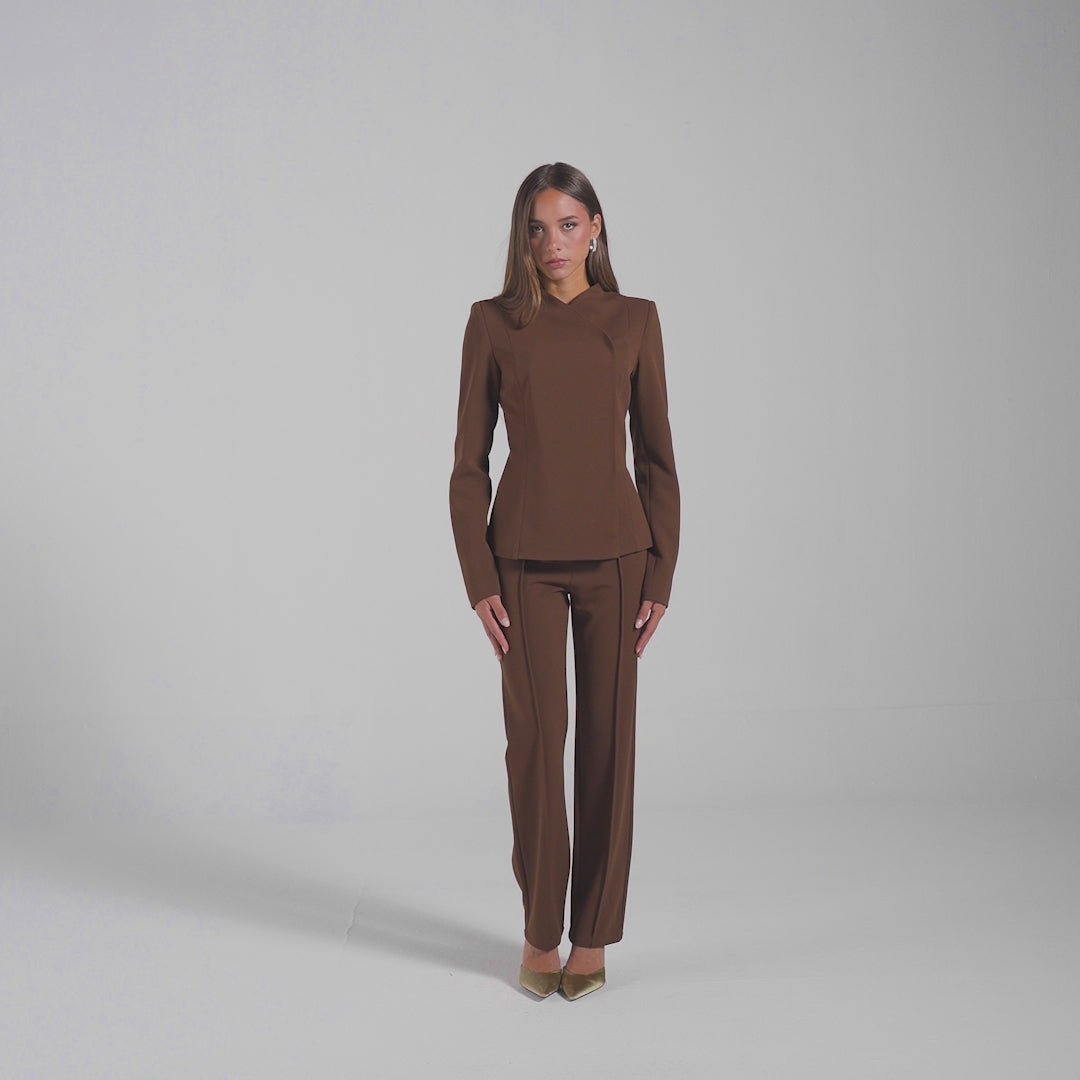 طقم كريب أنيق يتكون من بليزر بياقة V وبنطلون خصر عالٍ، بتصميم يجمع بين الرقي والراحة. يتميز البليزر بأزرار مخفية تمنحه مظهراً مرتباً وانسيابياً، بينما يبرز البنطلون عالي الخصر القوام بشكل جذاب. يضمن قماش الكريب الناعم حرية الحركة، مما يجعله خياراً مثالياً للعمل أو اللقاءات المسائية الأنيقة.