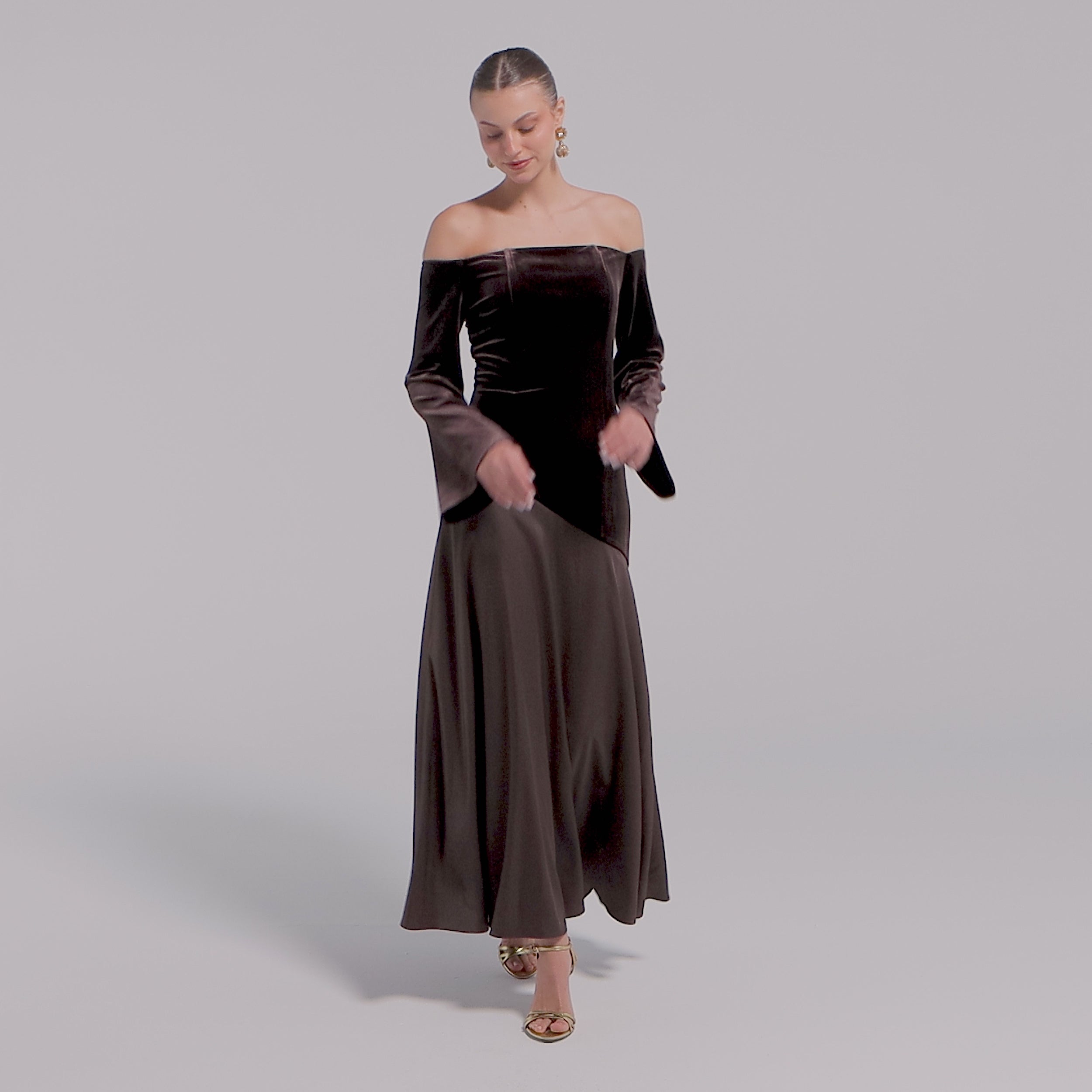 فستان بني غامق مخمل وساتان بأكتاف مكشوفة وأكمام بالون