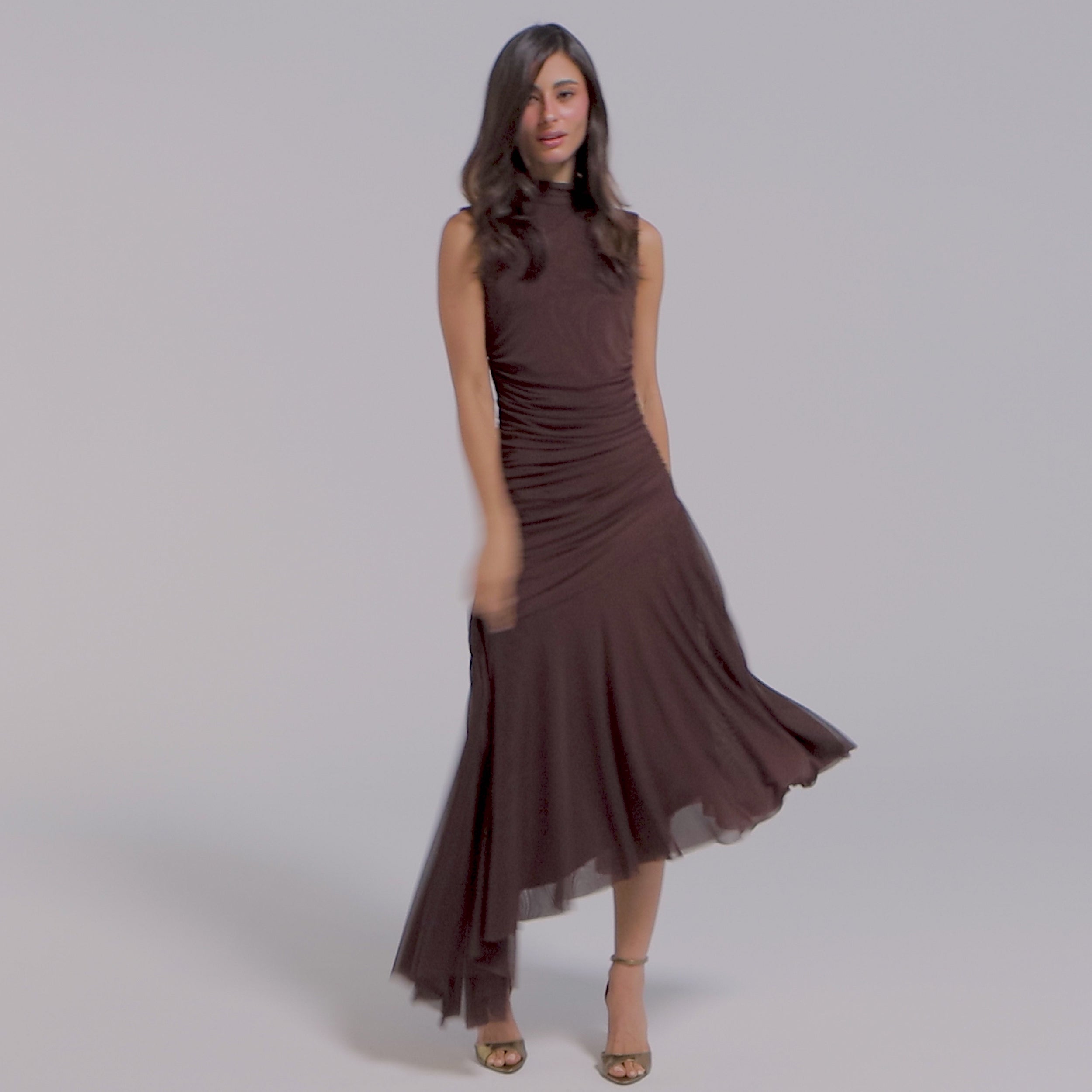 يحدد هذا الفستان المصنوع من التول الاسترتش القوام بشكل مريح ويسمح بالحركة بكل أريحية. يأتي بثنيات تعطي تحديداً أنثوياً من دون ضيق، بينما تنساب التنورة ذات الكسرات الناعمة بسلاسة مع كل خطوة. تضيف الياقة المرتفعة والتصميم بلا أكمام لمسة عصرية، وتعطيه الحاشية غير المتساوية طابعًا مميزًا، ليناسب الأعراس أو حفلات العشاء الرسمية أو السهرات.