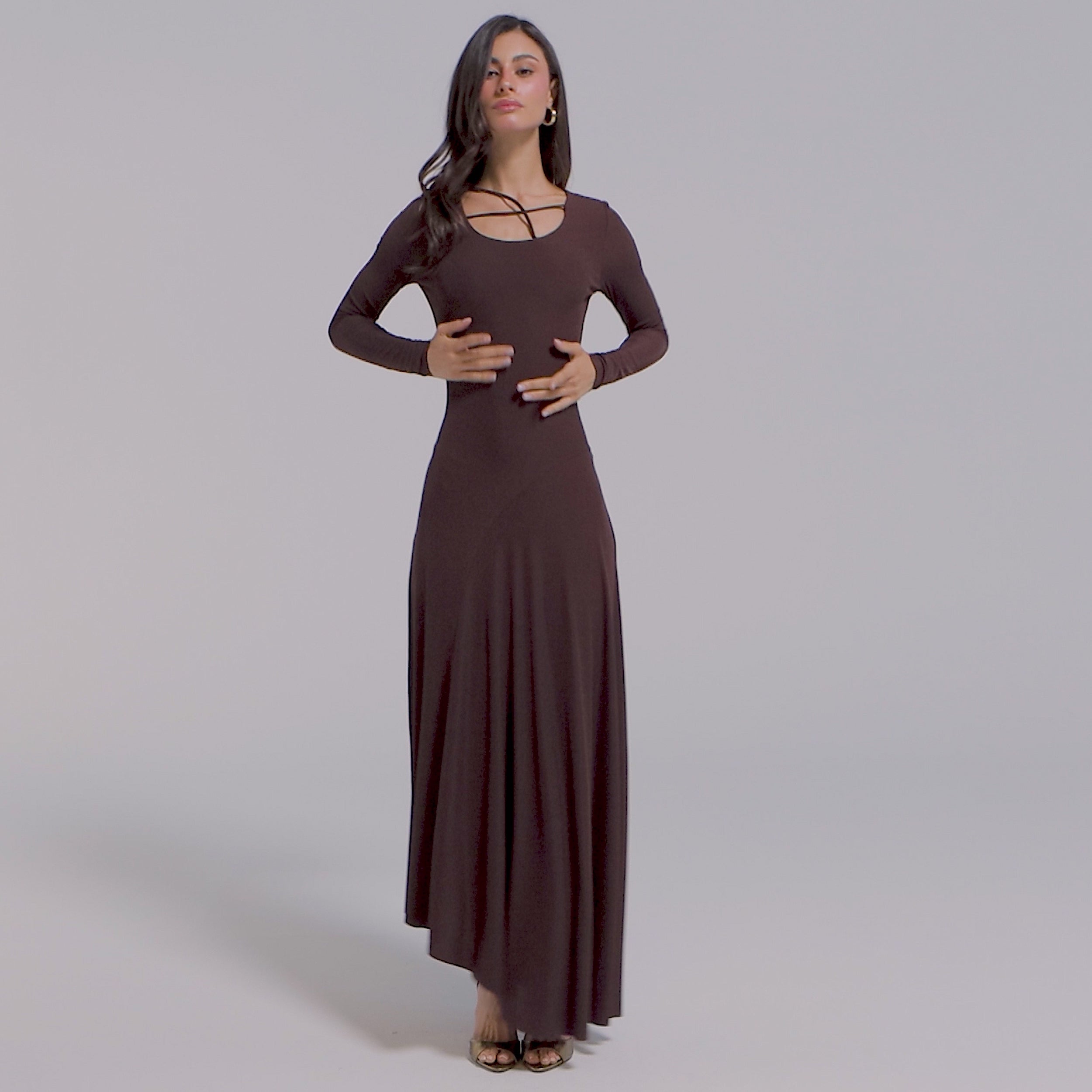 فستان ماكسي من قماش جيرسي بتفصيل بارز ومتداخل عند الصدر. يأتي بأكمام طويلة وياقة دائرية واسعة تضيف لمسة راقية، مع حاشية غير متساوية تمنحه طابع عصري.