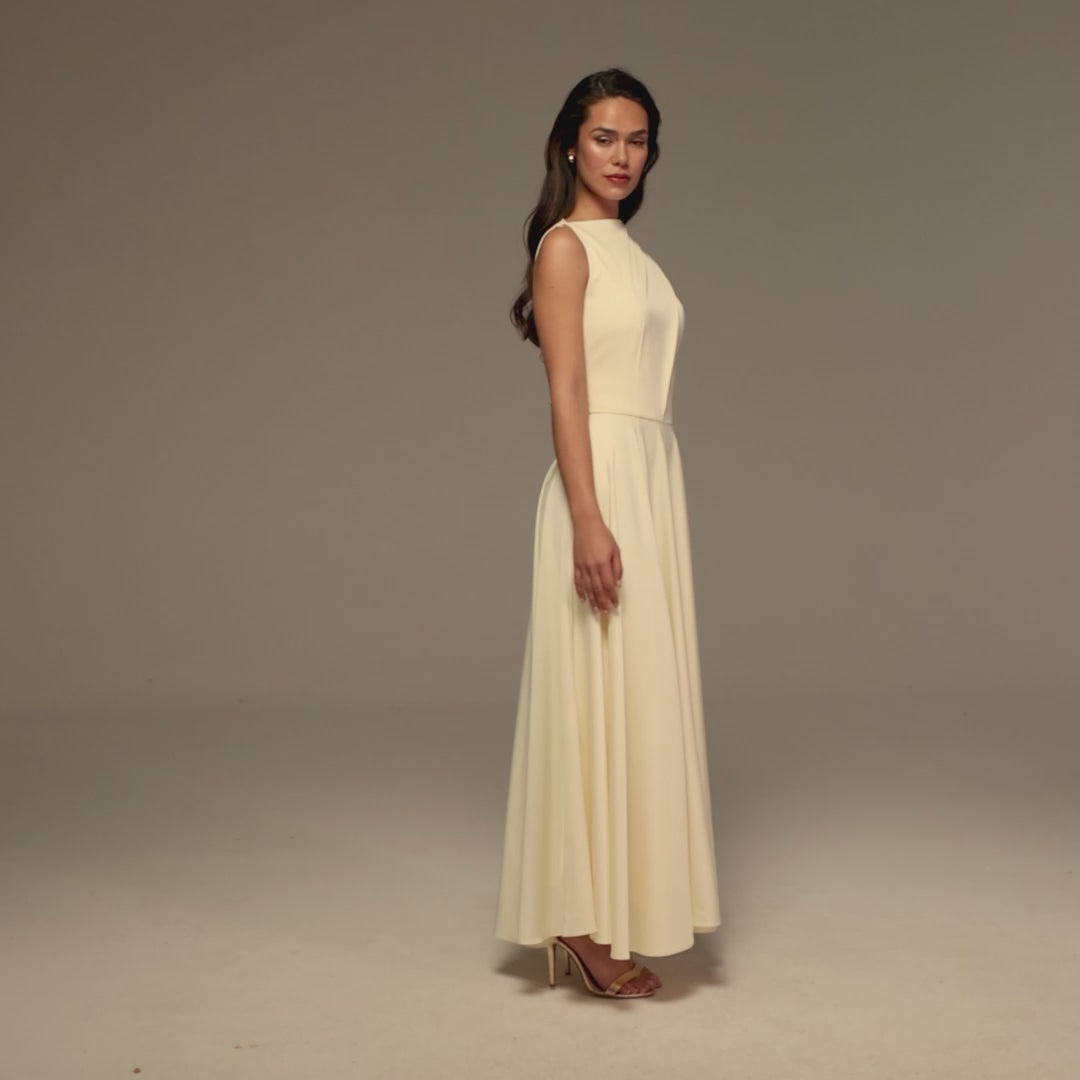 فستان ماكسي بدون أكمام مصمم من الساتان اللامع، يتميز بتنورة A واسعة تنساب بنعومة مع كل خطوة. الخصر المحدد يبرز القوام، فيما ينسدل السكارف من الخصر إلى الكتف ثم إلى الظهر بحركة انسيابية تضيف حضورًا جذابًا دون أي تكلف. هذا الفستان هو قطعة كلاسيكية بتفاصيل عصرية تلفت النظر.