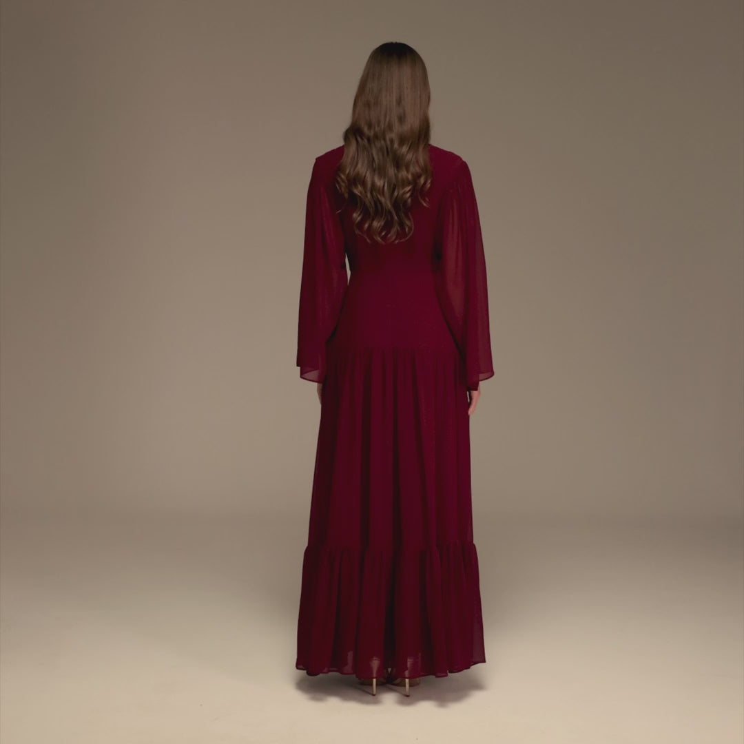فستان ماكسي من الشيفون بياقة دائرية مزمومة وأكمام طويلة واسعة تمنحك إحساسًا بالراحة. تأتي تنورته بطبقات تضيف حركة رقيقة مع كل خطوة، إنه قطعة ناعمة وانسيابية تناسب كل لحظة بدون مبالغة.