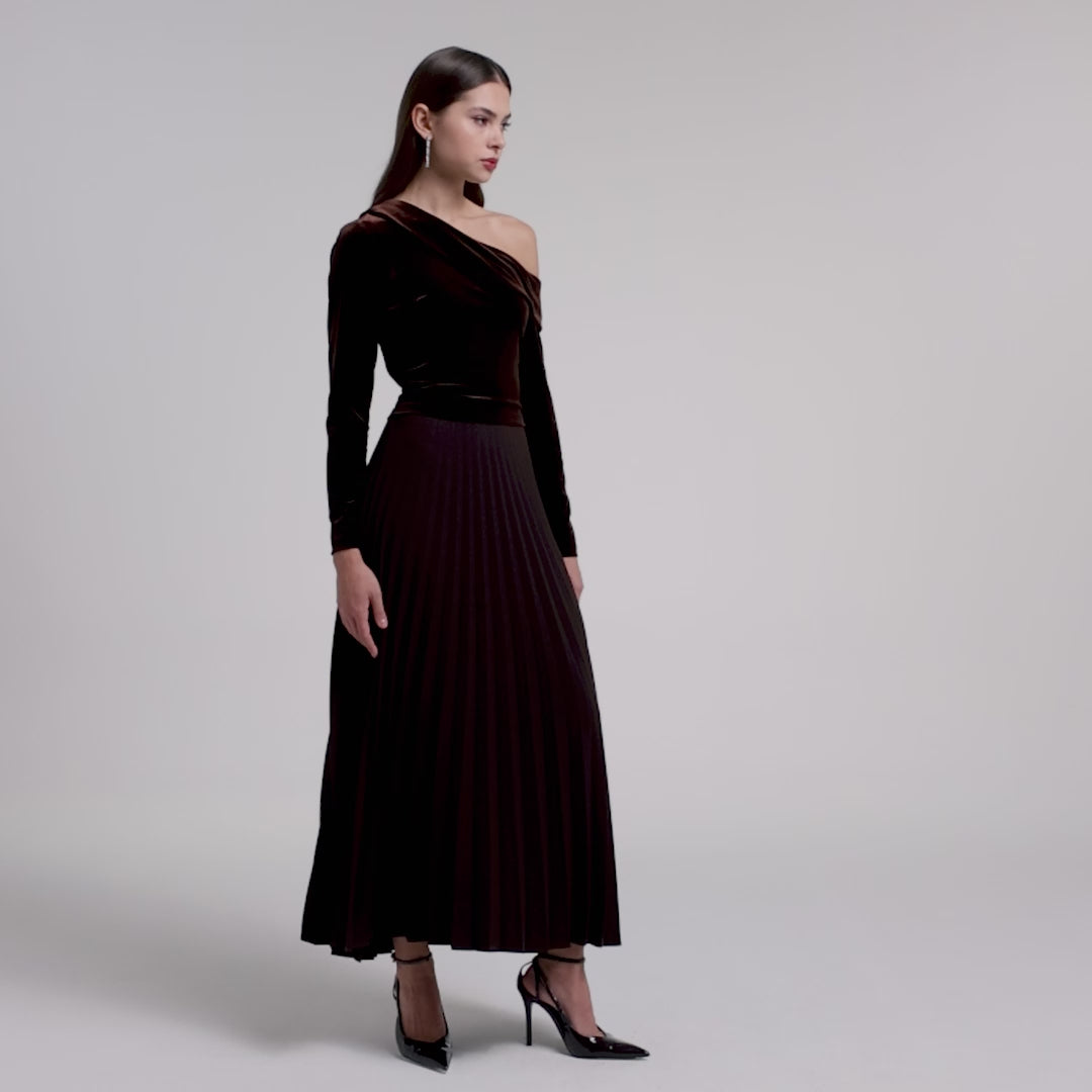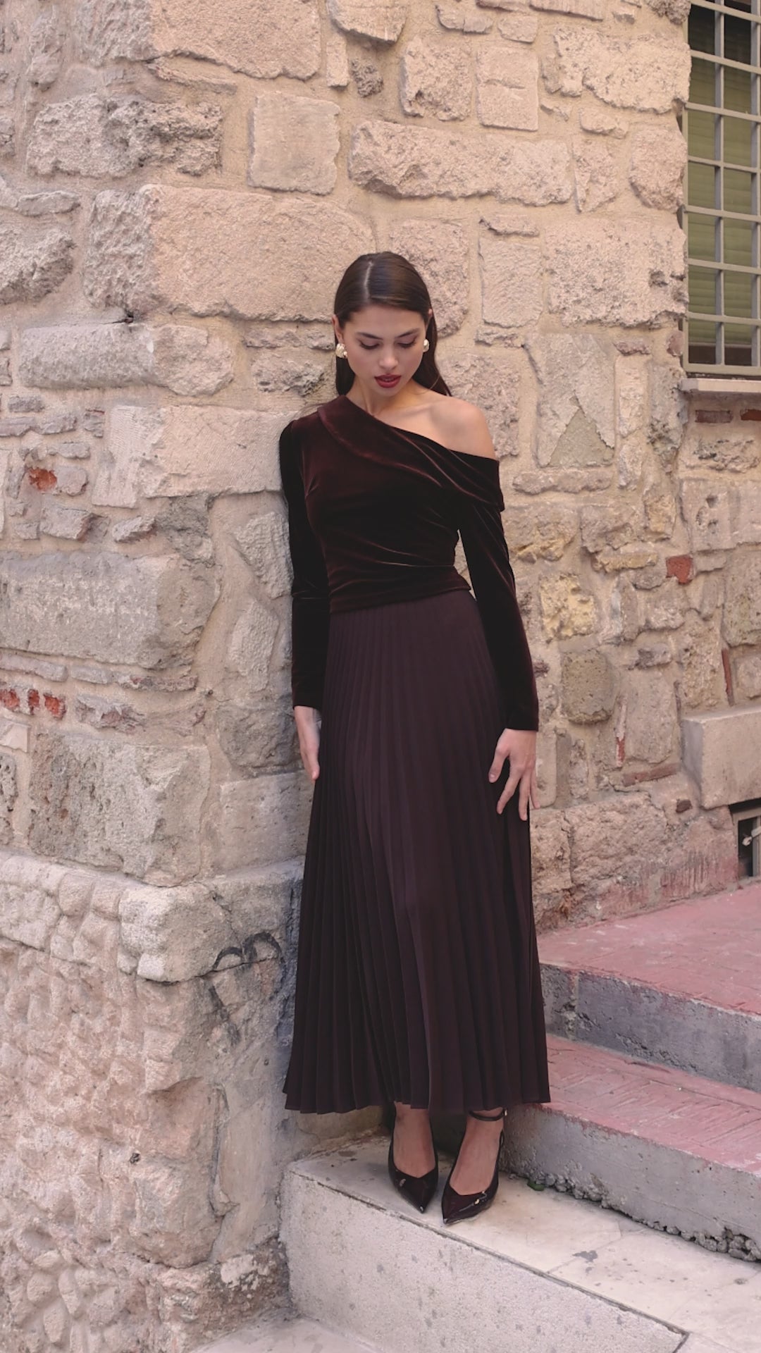 فستان ماكسي يجمع بين قماش المخمل في الجزء العلوي والكريب في التنورة. يأتي بياقة مطوية غير متماثلة تكشف الكتف من جهة واحدة تضيف لمسة أنثوية ناعمة، فيما تنسدل التنورة بقصة A بانسيابية. مناسب لمن يبحثن عن فستان أنيق وعصري ومريح في الوقت نفسه!