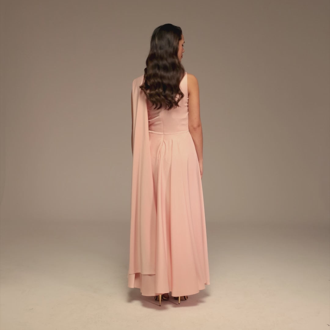 فستان ماكسي ساتان وردي بلا أكمام مع وشاح