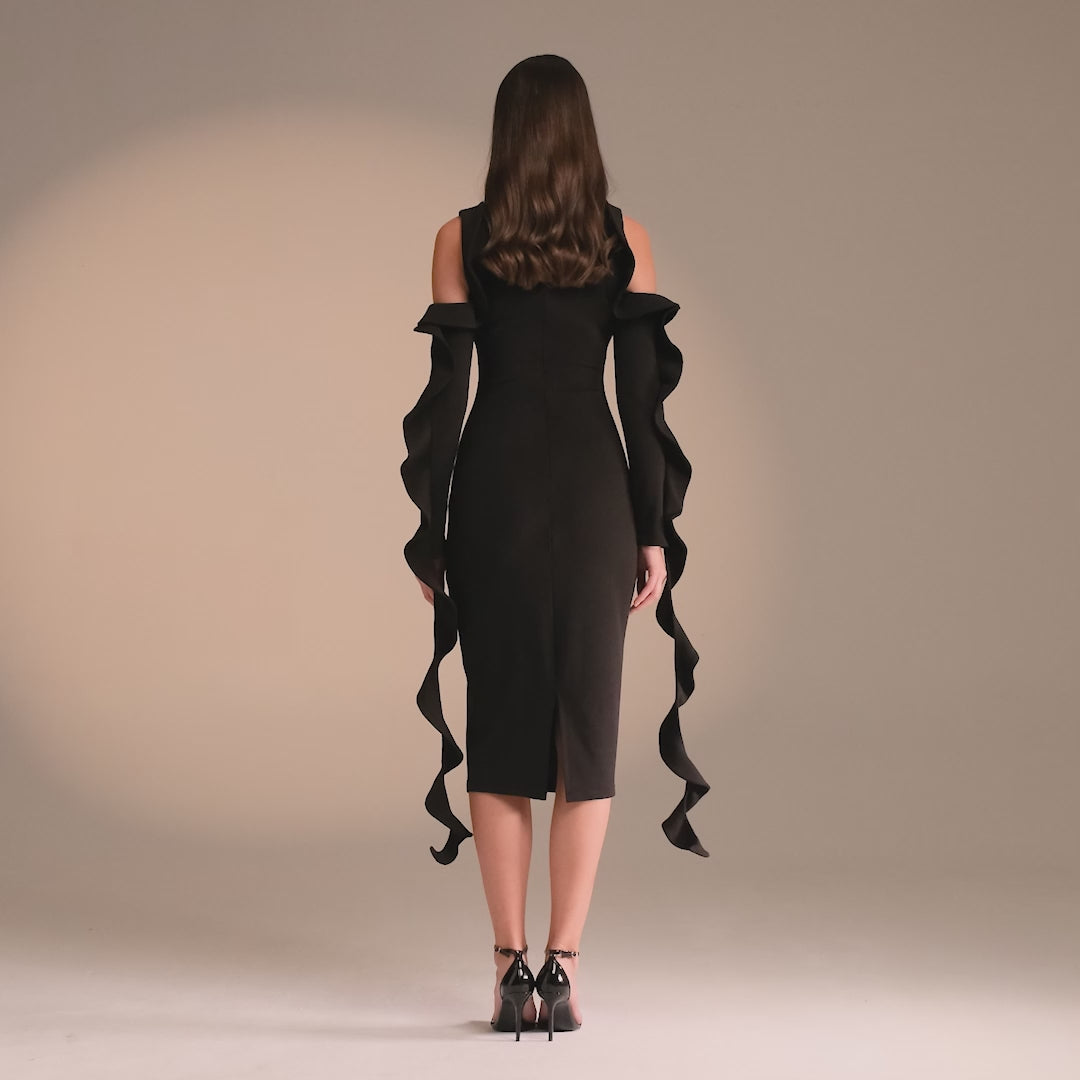 نقدم لكم فستاننا متوسط الطول ذو الكتف البارد باللون الاسود، والذي يتميز بأكمام مذهلة وتصميم عصري على الكتف. مصنوع من قماش الكريب الفاخر لملاءمة مريحة وأنيقة.