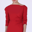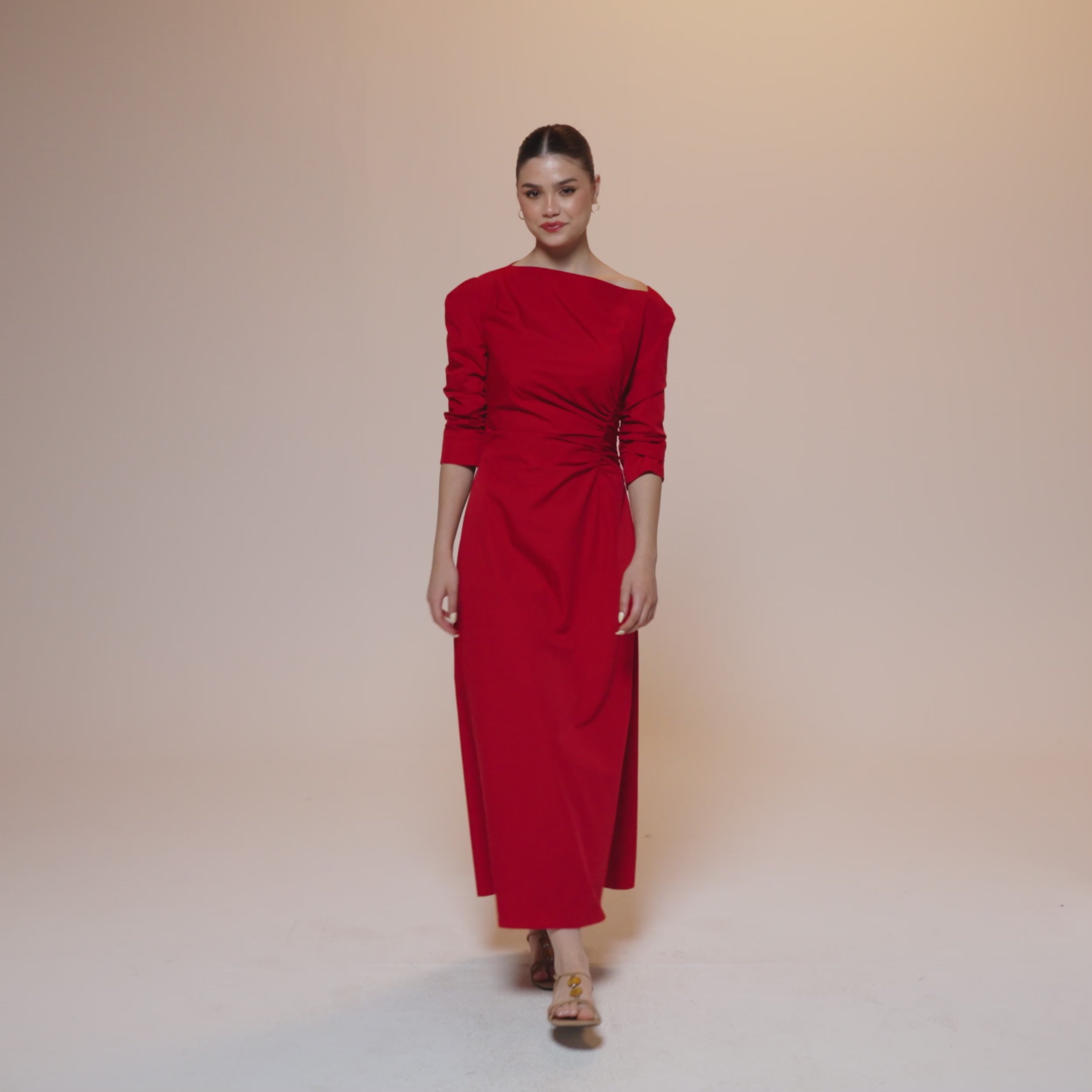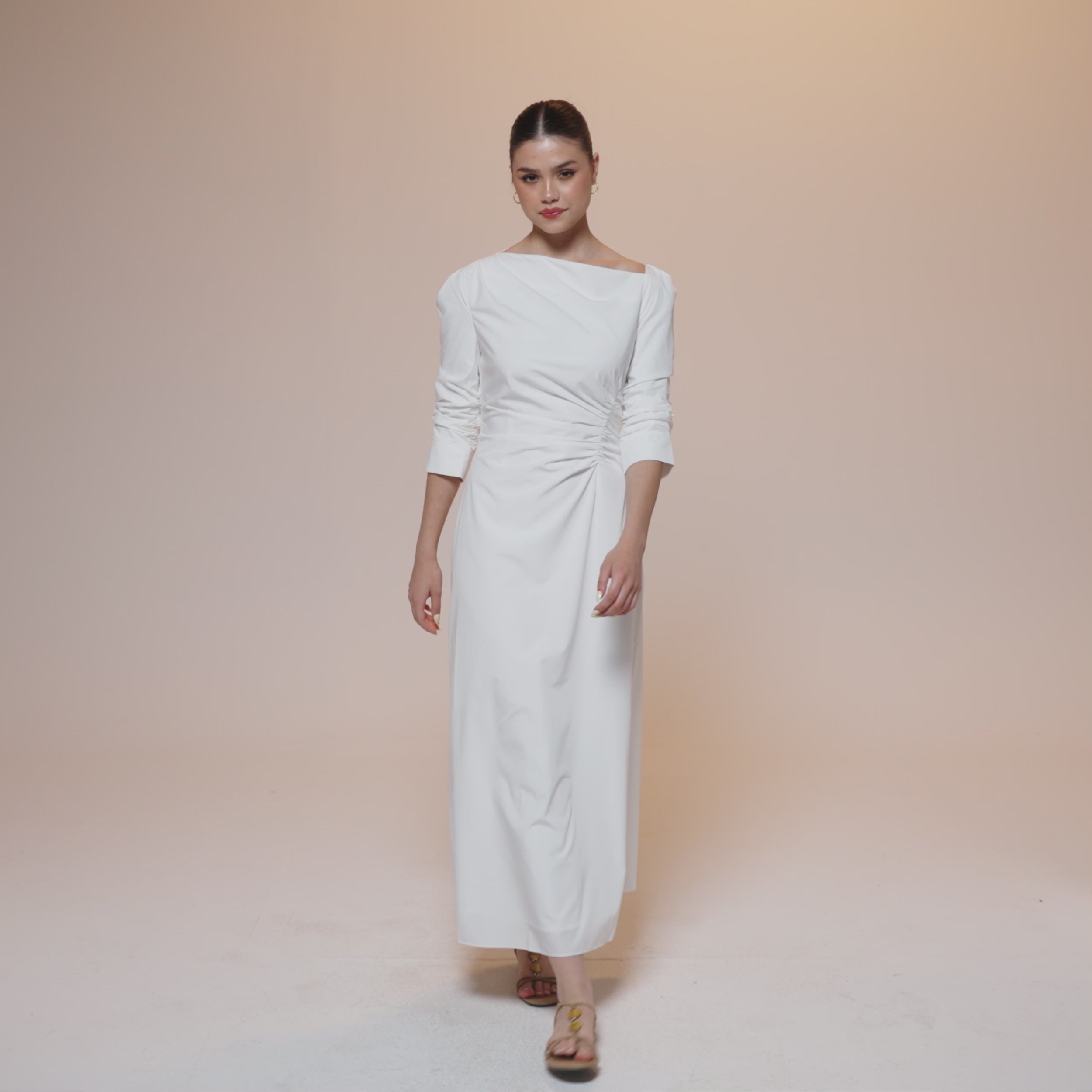 فستان ماكسي بخصر منخفض من مجموعة صيف 2025. يتميّز بقصة كتف غير متماثلة، وزمة جانبية وأكمام مثنية متوسطة الطول، كما يأتي بتنورة ماكسي بليسيه من الشيفون تنسدل من خصر منخفض.