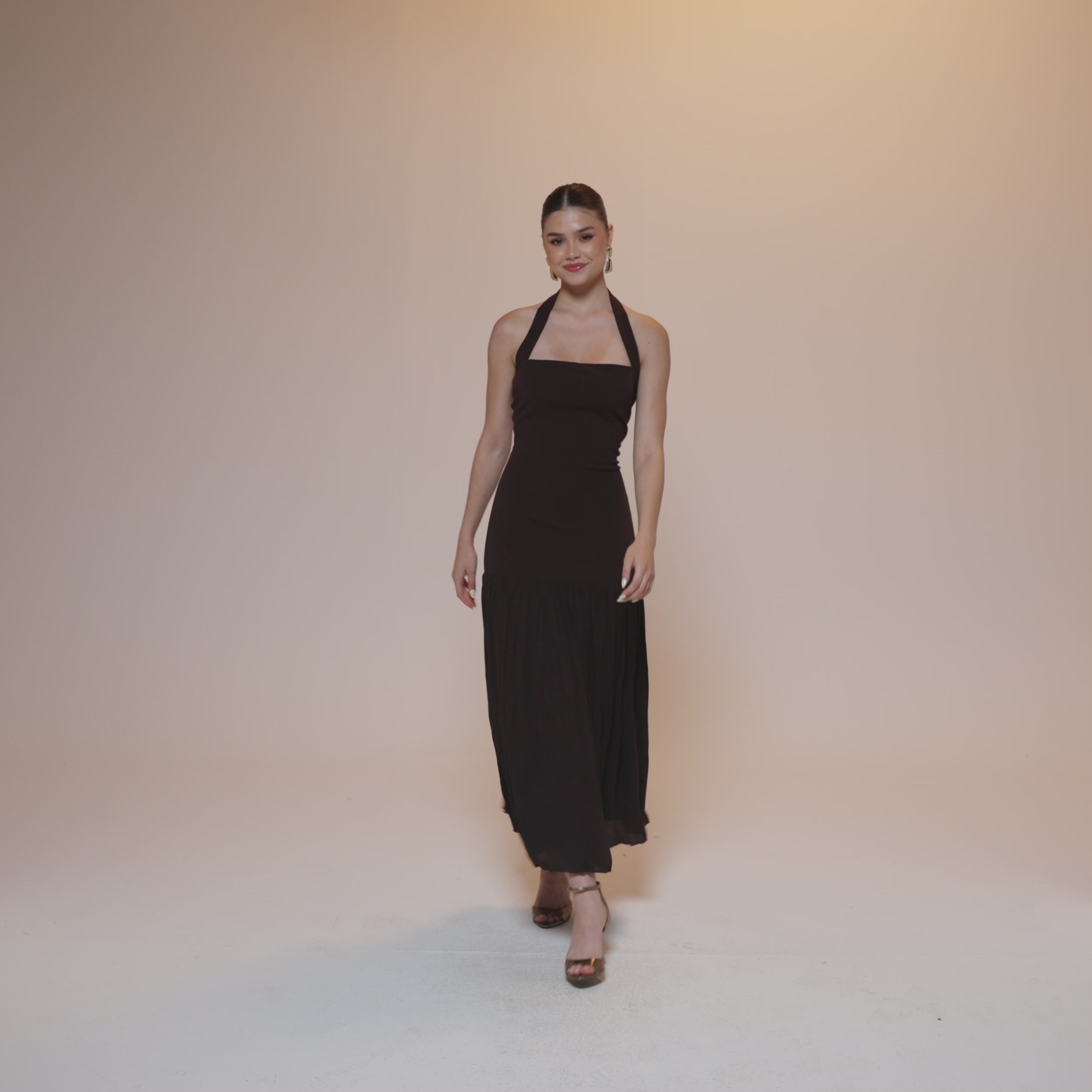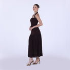 فستان ميدي كريب بحمالات هالتر من مجموعة صيف 2025. يتميّز بجزء علوي باللون الأسود بتصميم هالتر، وتنورة بيضاء بلييسيه تنسدل من خصر منخفض، لتمنحك مزيجًا من التصميم الناعم والحركة الانسيابية.