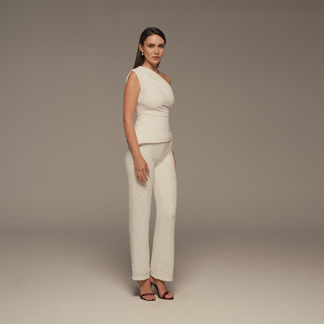بنطلون واسع من الترتر مصمم ليمنح إطلالتكِ حضور ولمعان. يأتي بقصة مريحة تسمح لكِ بحرية الحركة، ما يجعله خيار مثالي للسهرات الطويلة والمناسبات الخاصة.