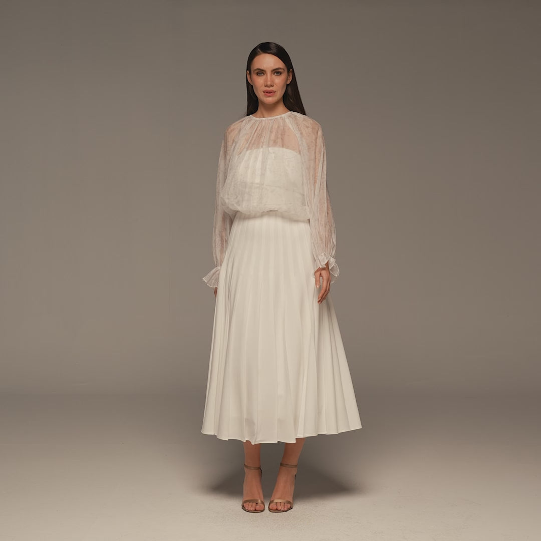 تنورة ميدي بلون عاجي بكسرات ناعمة تمنحك شكل مرتب وحركة انسيابية مع كل خطوة. ترتّب قصة A شكل القوام وتنسدل دون التصاق، ما يجعلها مريحة وسهلة الارتداء، وقطعة عملية تناسب الإطلالات اليومية والمناسبات البسيطة.
