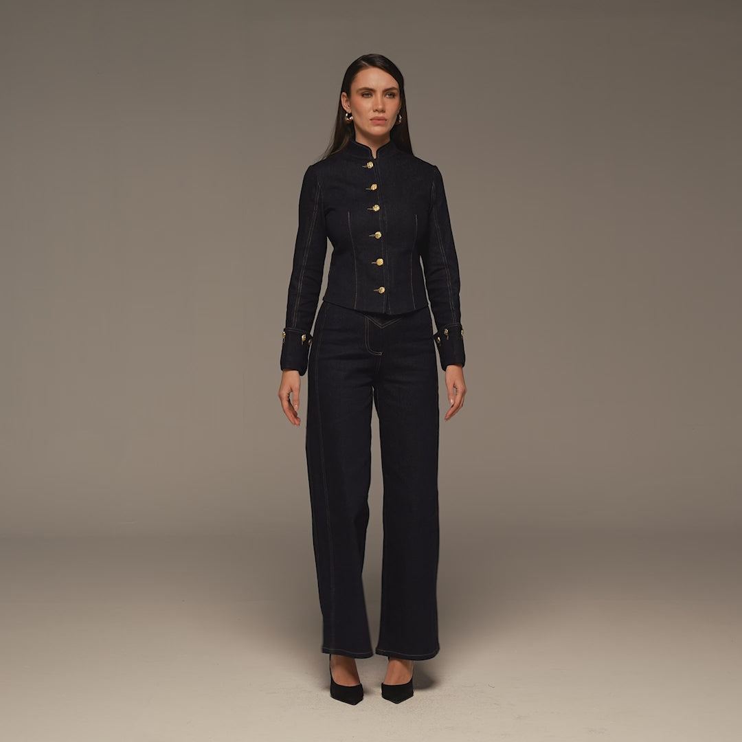 جاكيت دنيم بأزرار ذهبية بقصة محددة تبرز القوام، مع ياقة عالية تضيف لمسة عصرية مرتبة، وأكمام بحواف واسعة أنيقة. إنها قطعة عملية تناسب الأيام التي تحتاجين فيها مظهر كاجوال مرتب ومريح دون مجهود.