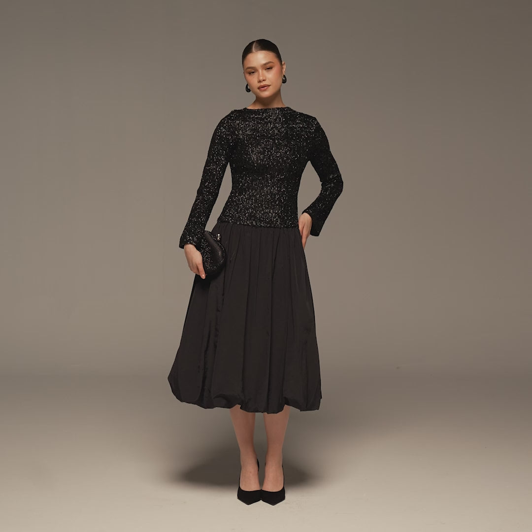 فستان أسود ميدي بجزء علوي من الترتر بلمعة لافتة ناعمة، وتنورة من قطن بوبلين تمنحك خفة وراحة طوال الوقت. يأتي الفستان بتصميم بسيط لكن جذاب، ما يجعله مثالي للارتداء في المناسبات التي تمتد لساعات دون إحساس بالثقل.