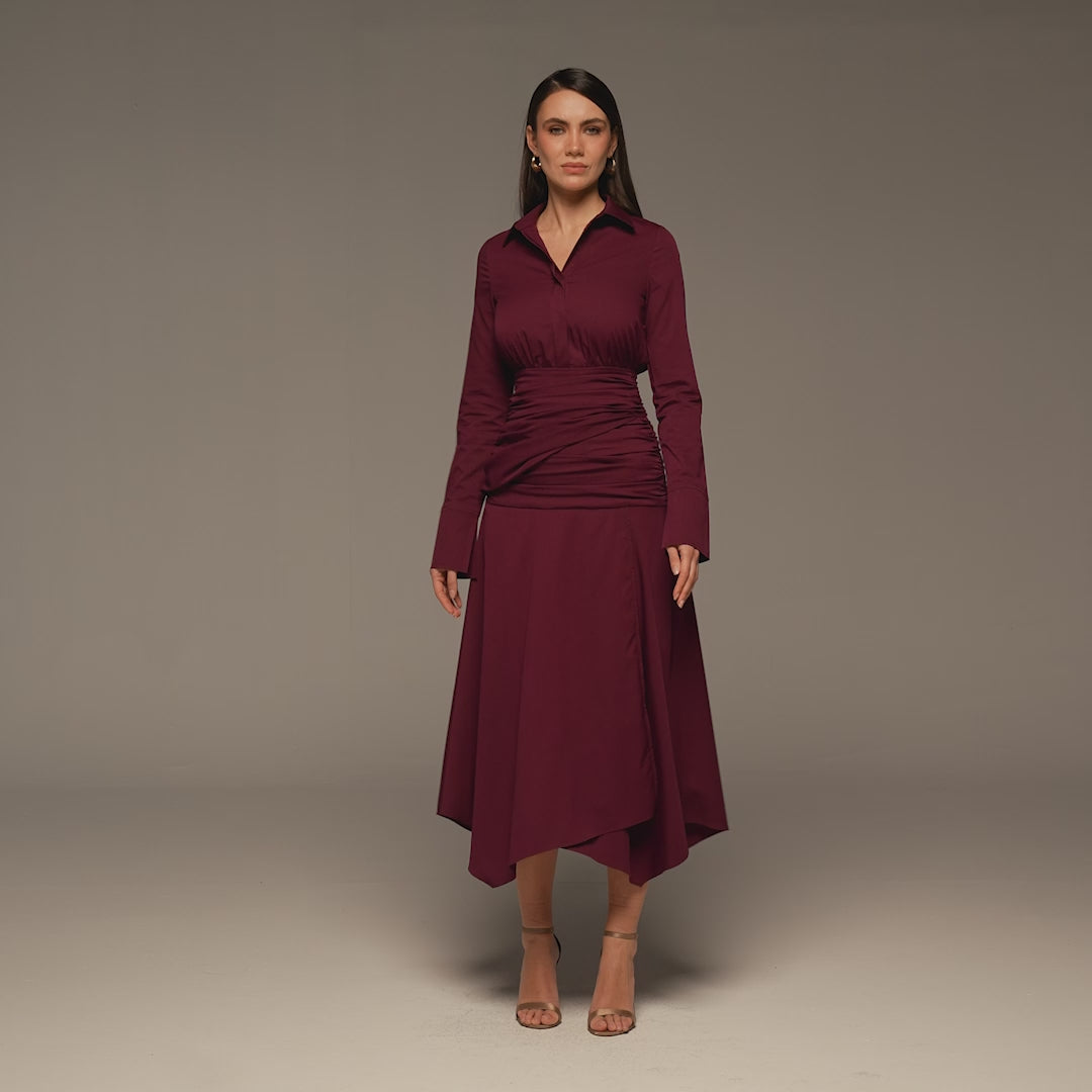 فستان ميدي بقصة قميص من قماش قطن بوبلين. يأتي بزمات ناعمة عند الخصر تمنح تحديد للقوام دون تقييد، وتضيف فتحة الصدر V مع الياقة لمسة كلاسيكية أنيقة، بينما تتمايل الحافة غير المتساوية بحركة طبيعية مع كل خطوة.