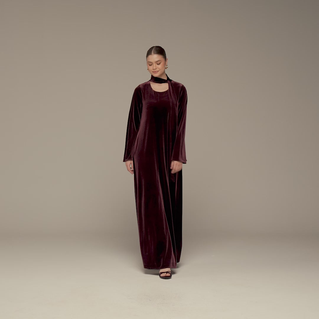 فستان ماكسي بني من المخمل يمنحكِ حضور هادئ ومريح في الوقت نفسه. ينسدل المخمل بنعومة على الجسم دون تقييد، ويضيف سكارف الرقبة المتصل لمسة عصرية راقية، بينما تمنح الأكمام الطويلة والقصة الماكسي تغطية عملية تجعل الفستان خيار مثالي للمناسبات المسائية، العزائم، أو اللقاءات الرسمية في الأجواء الباردة.