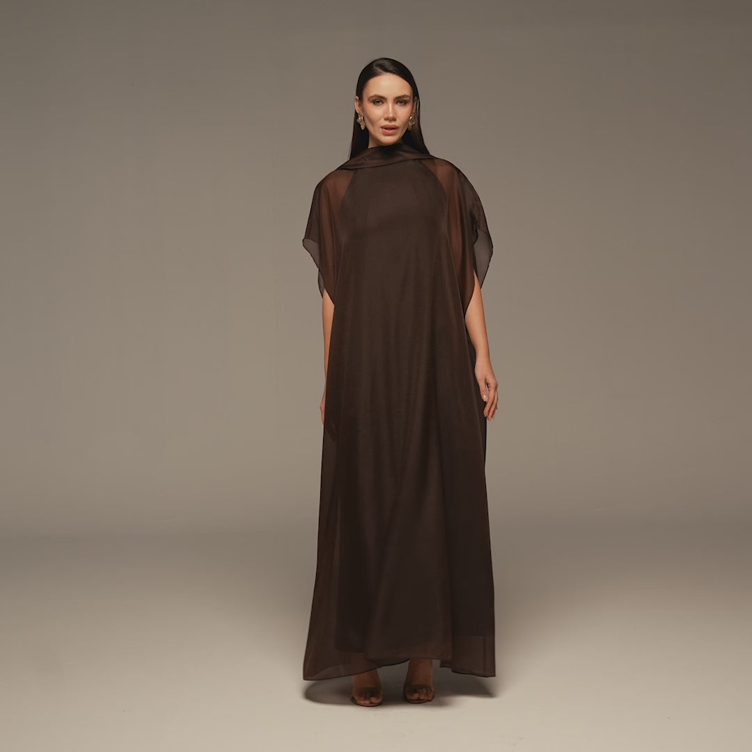 فستان بني ماكسي بياقة عالية مع كاب بشال