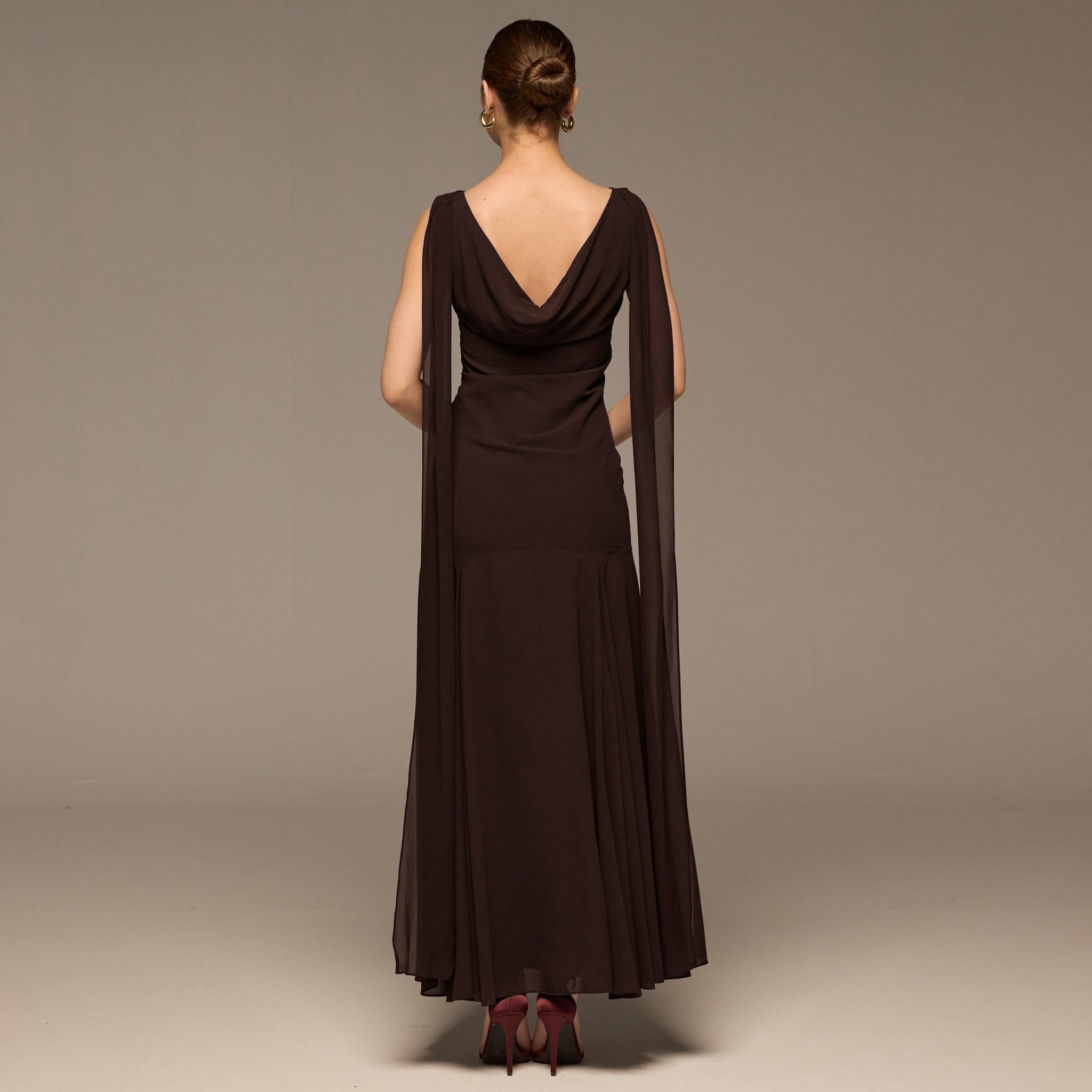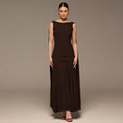 فستان بني ماكسي شيفون مطرز بدون أكمام