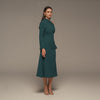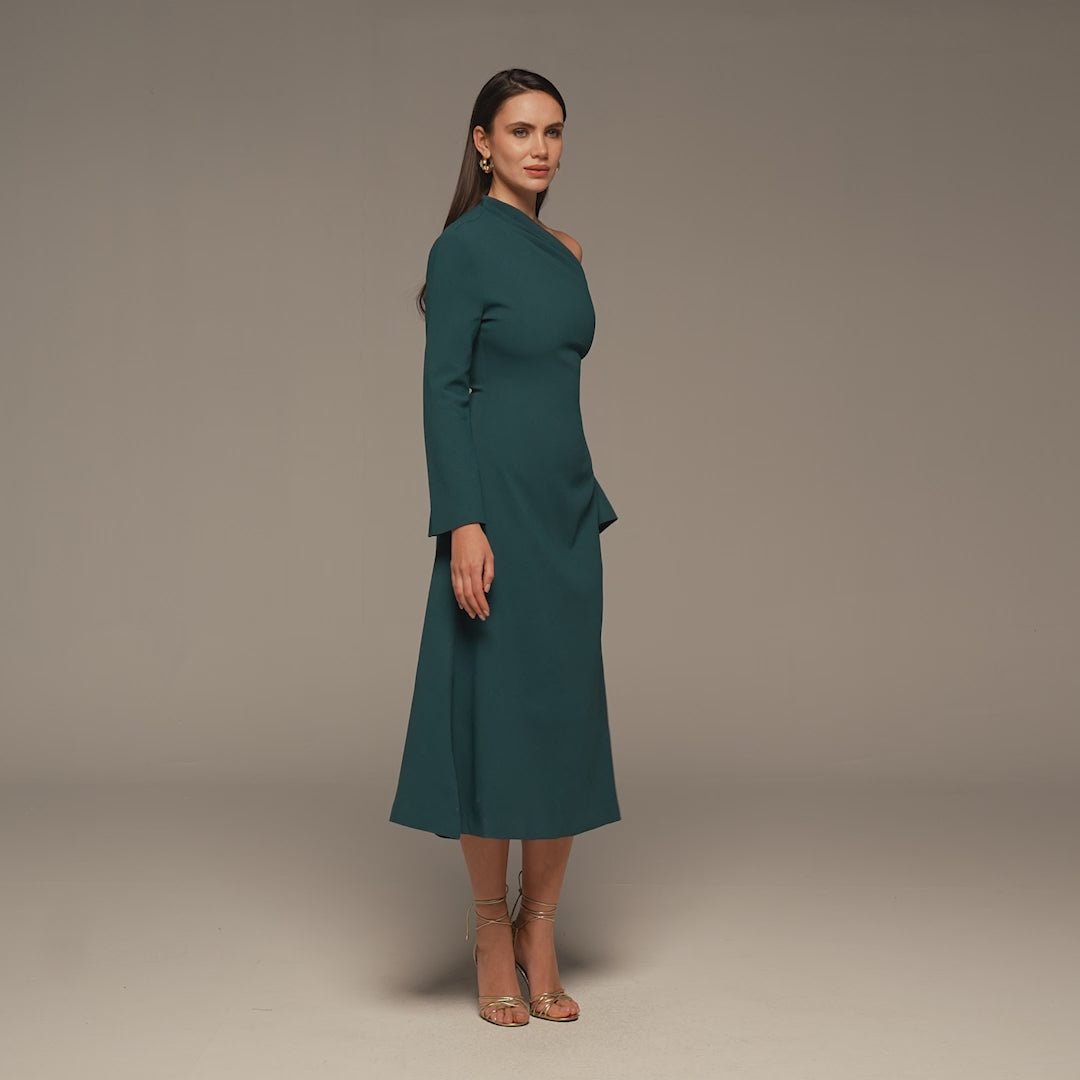 فستان ميدي من الكريب هو قطعة عصرية وسهلة التنسيق. يأتي بتصميم غير متماثل حيث يغطي أحد الأكمام الكتف بينما ينسدل الآخر بانسيابية ناعمة تضيف لمسة عصرية للفستان. تمنح قصة الـ A راحة وحركة خفيفة، مع الحفاظ على شكل مرتب ومحدد.