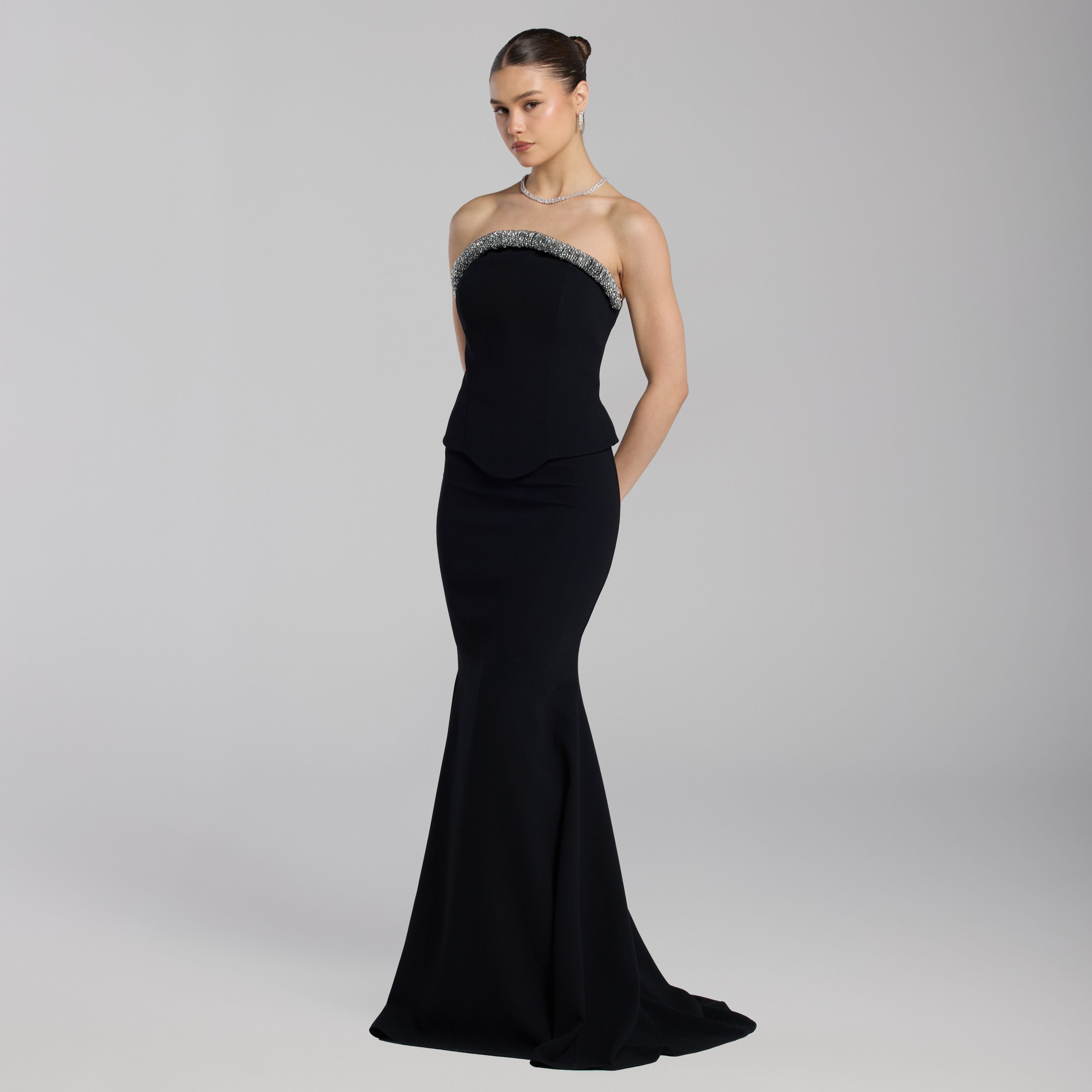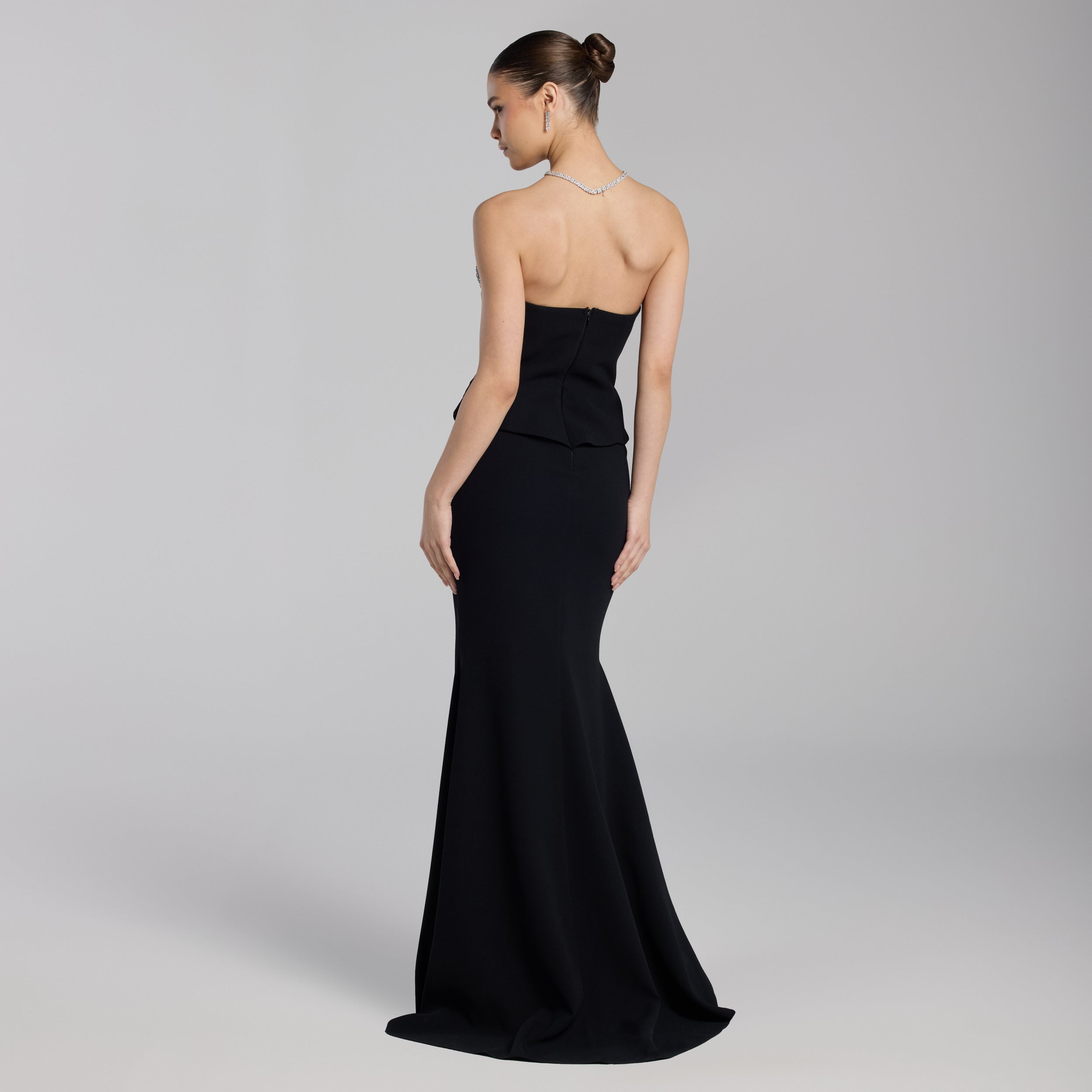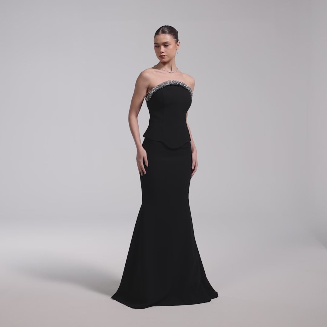 فستان سهرة كريب أسود يمنحكِ إطلالة جذابة وأنيقة بدون مجهود. تبرز قصة الياقة جمال الأكتاف، ويمنحك التوب ثبات مريح على الجسم بدون ضيق، بينما تنسدل التنورة الطويلة بقصة ناعمة تجعل الفستان مناسب لسهرات المساء والمناسبات العائلية.