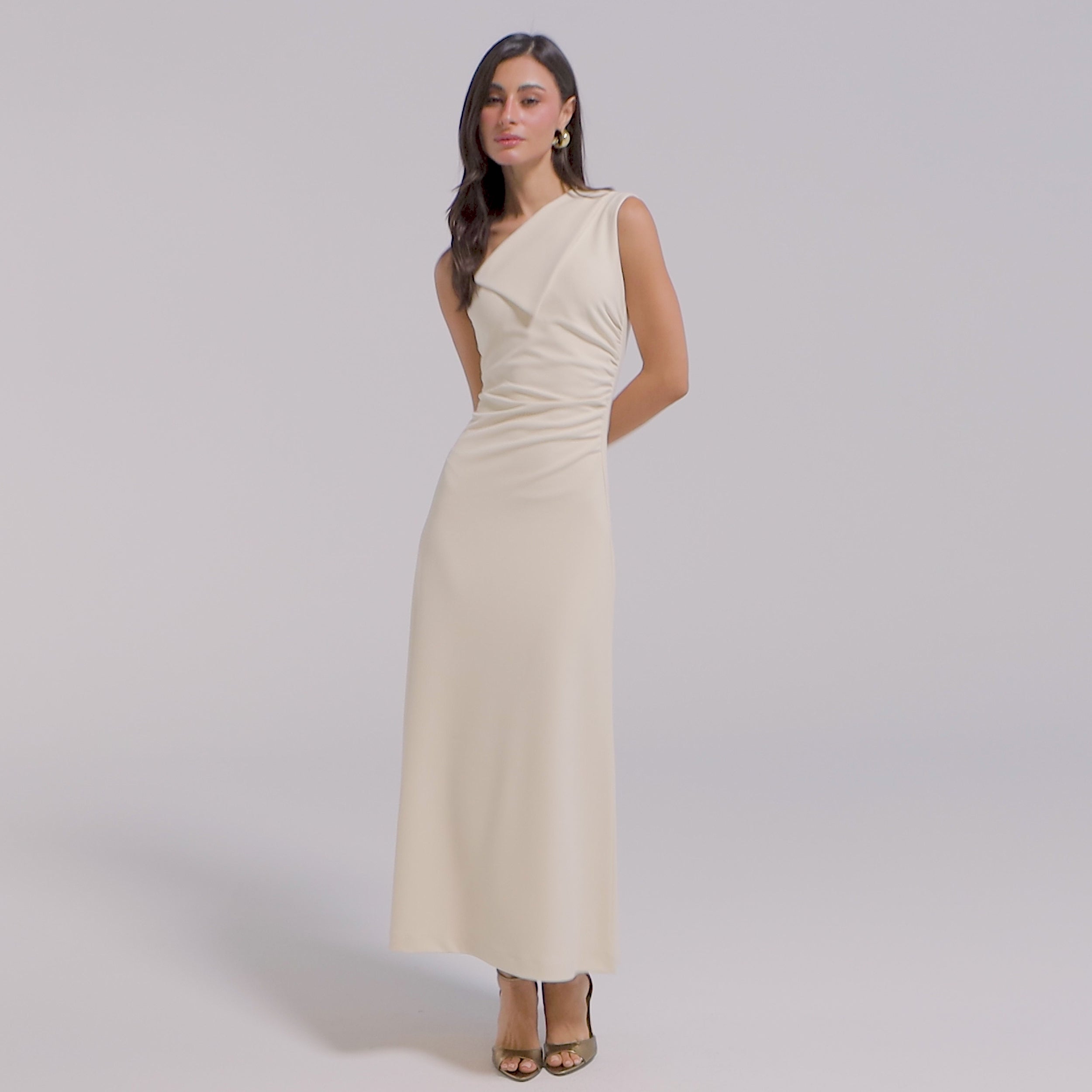 فستان كريب ماكسي بياقة مطوية غير متماثلة