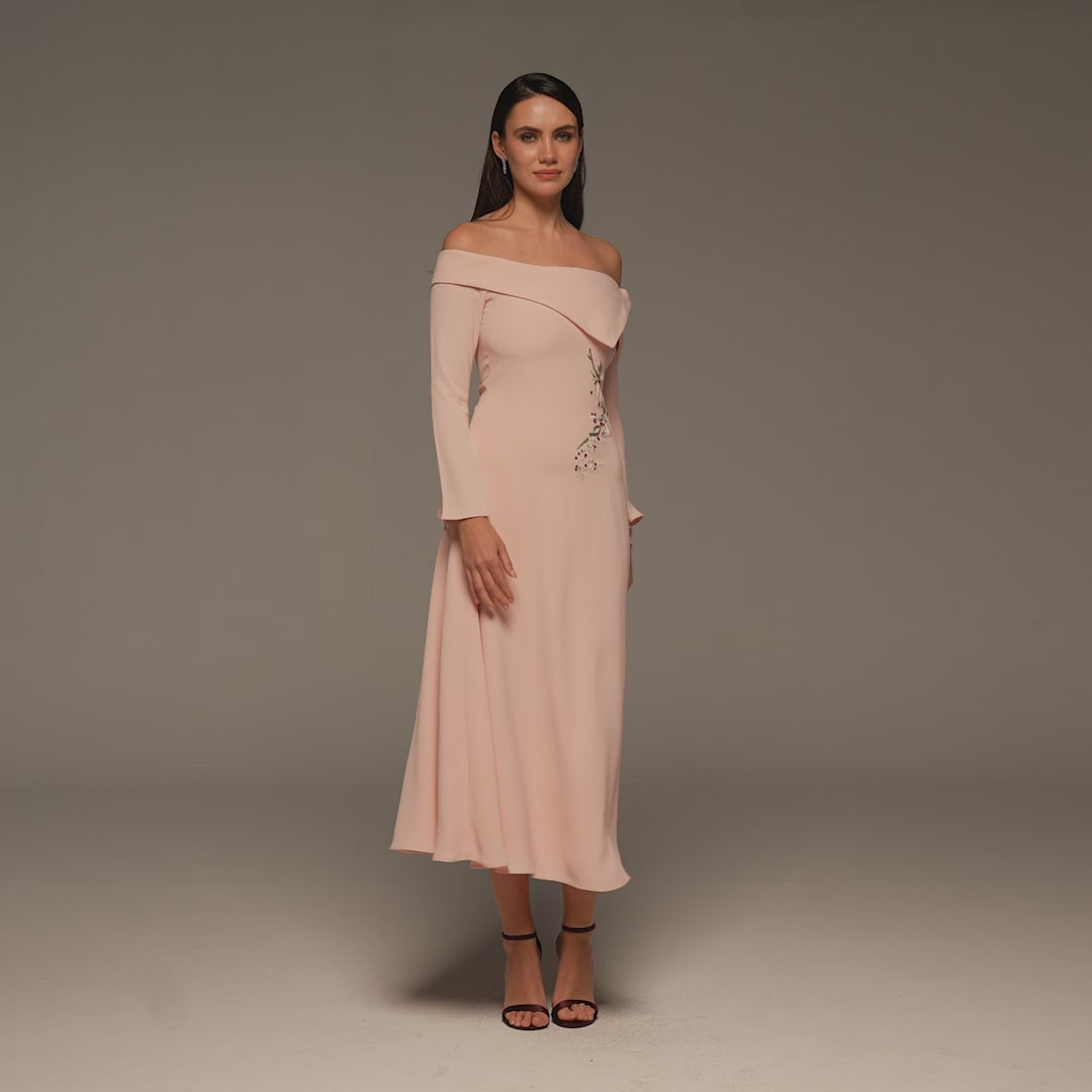 فستان وردي فاتح من الكريب بياقة مطوية ثابتة بشكل مرتب على الكتفين. يضيف التطريز الناعم لمسة حيوية جميلة، بينما ينسدل قماش الكريب بانسيابية على الجسم بقصة A مريحة في الحركة. خيار مناسب لاحتفالات العيد عندما ترغبين بإطلالة أنثوية بتفاصيل ناعمة.