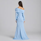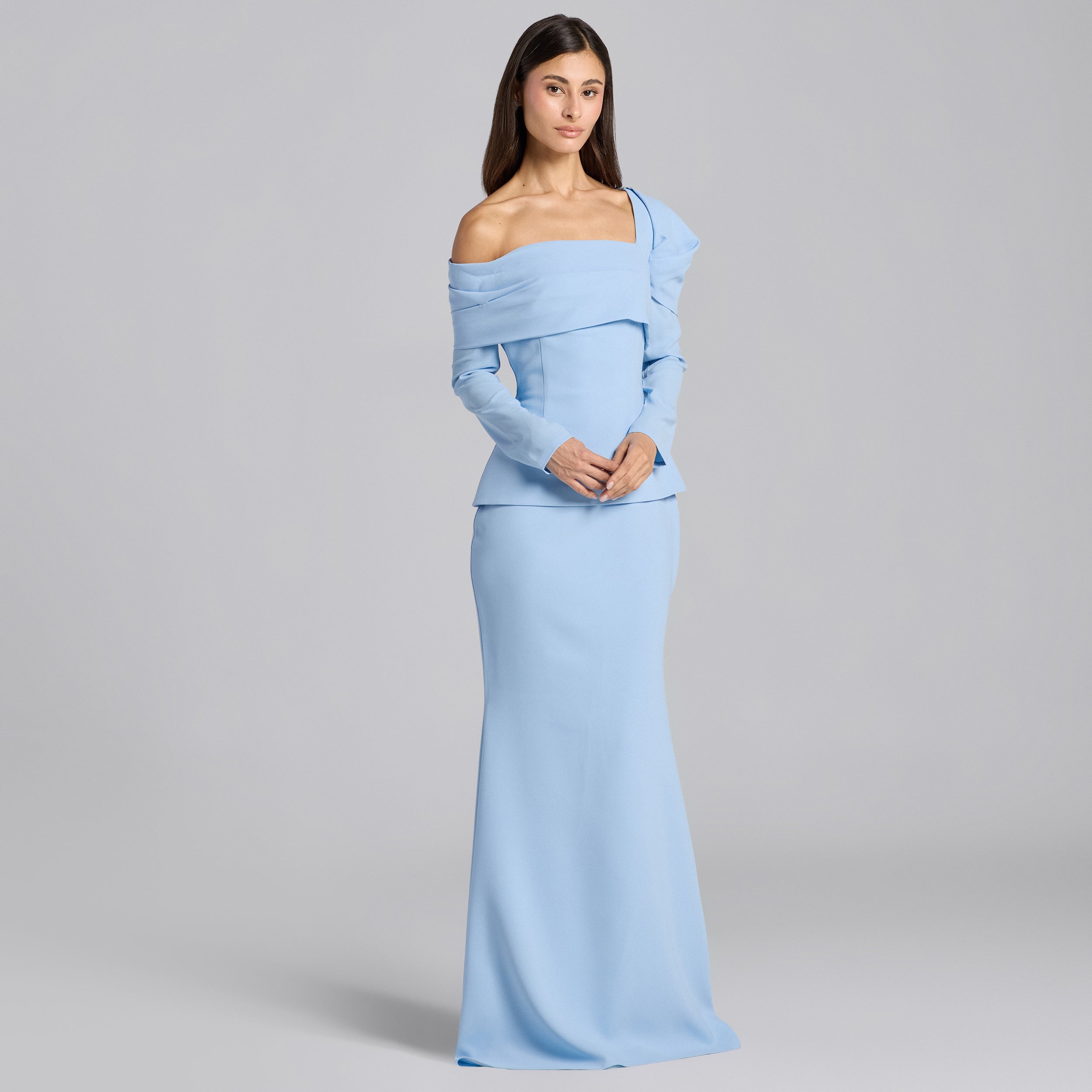 Baby Blue Crepe Off Shoulder Draped Maxi Dress