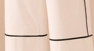 انغمس في الأناقة البسيطة مع بنطالنا الأبيض ذو الخطوط السوداء. يتميز التصميم الكلاسيكي بقماش خفيف لإحساس مريح ومتجدد الهواء، بينما تضفي الخطوط السوداء لمسة عصرية. مثالي لأي مناسبة.