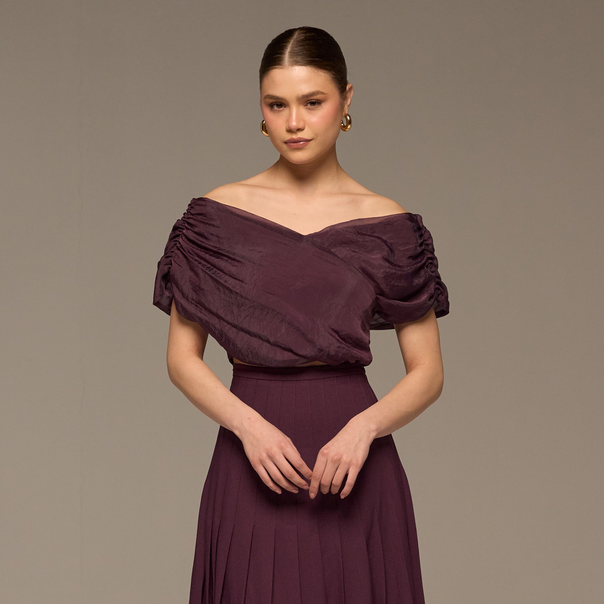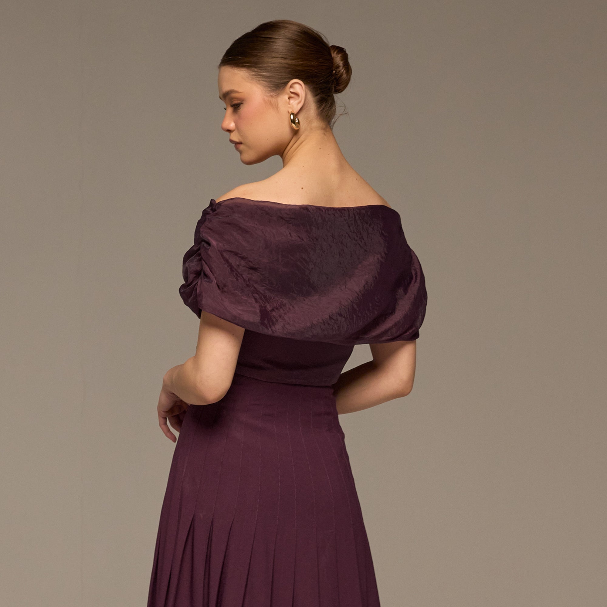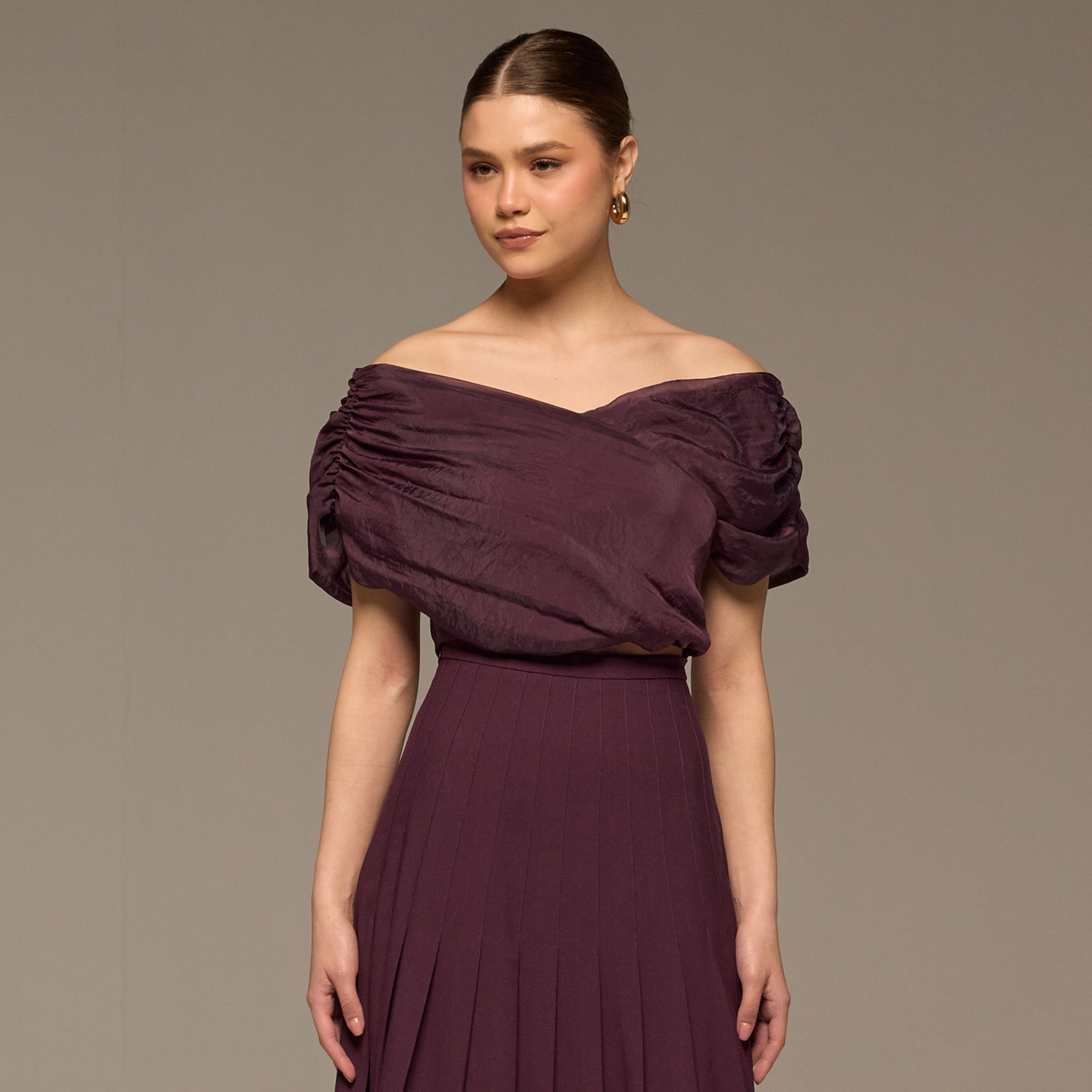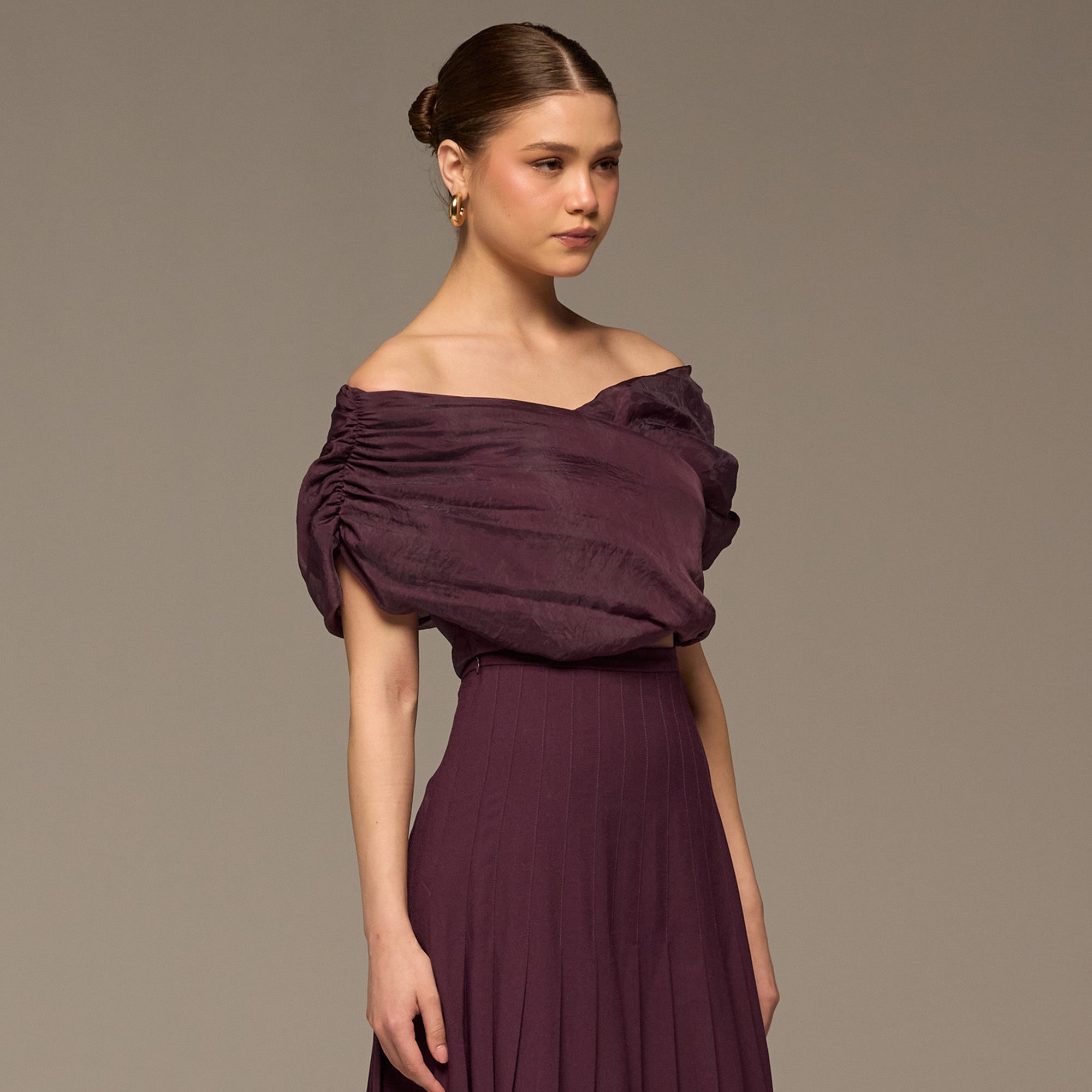بلوزة أورجانزا بلون بنفسجي بأكتاف مكشوفة