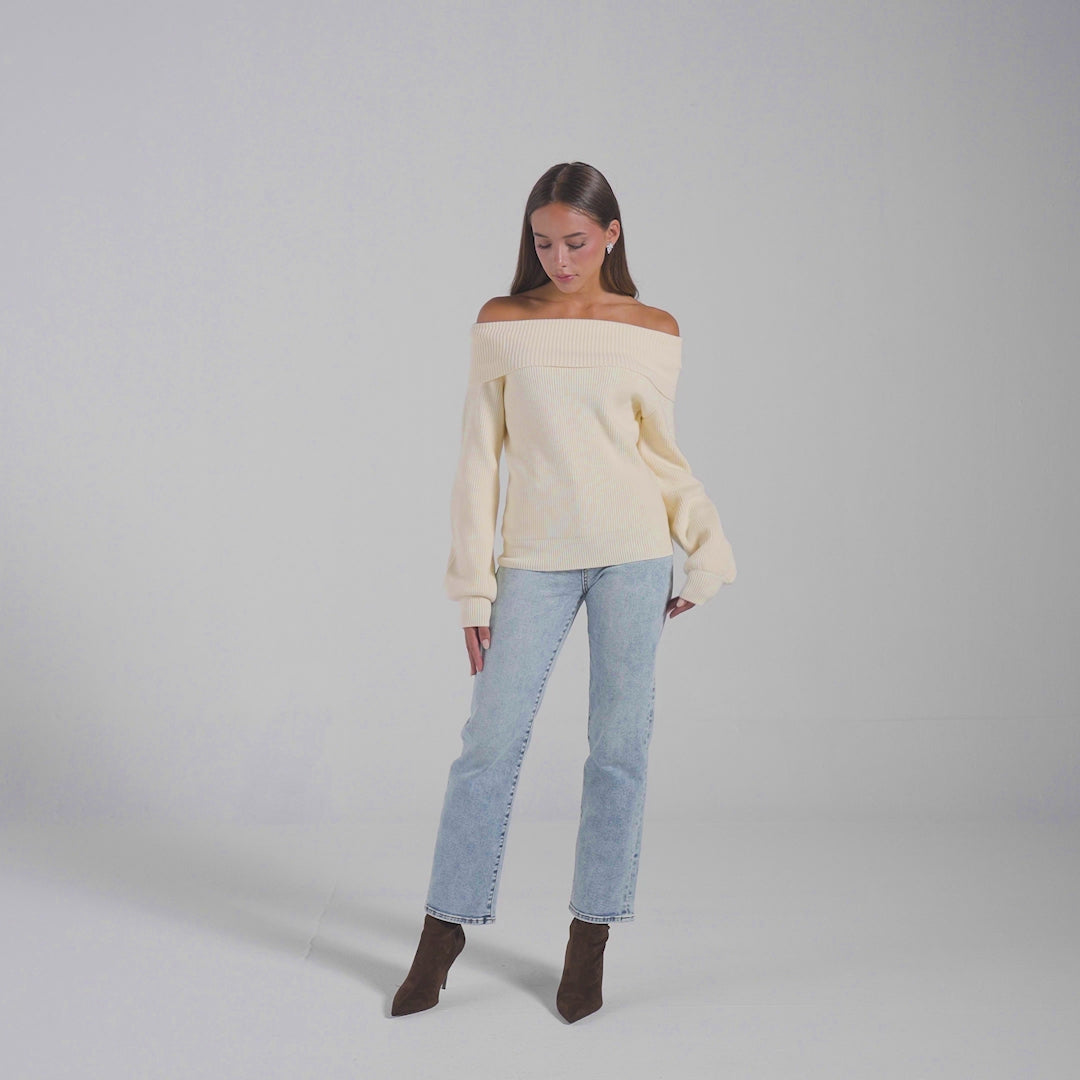 سويتر تريكو عاجي كتف مكشوف مطوي بأكمام بالون