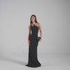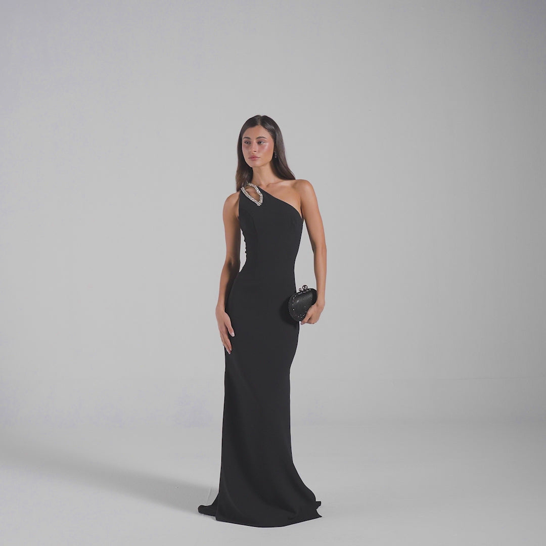 Embrace timeless elegance with this Black Crepe Maxi Dress, featuring delicate crystal trim that adds a refined sparkle. Crafted from soft crepe fabric, it drapes beautifully for a flattering silhouette, perfect for formal occasions or evening events. The maxi length enhances its graceful appeal, making it a sophisticated choice for your wardrobe.