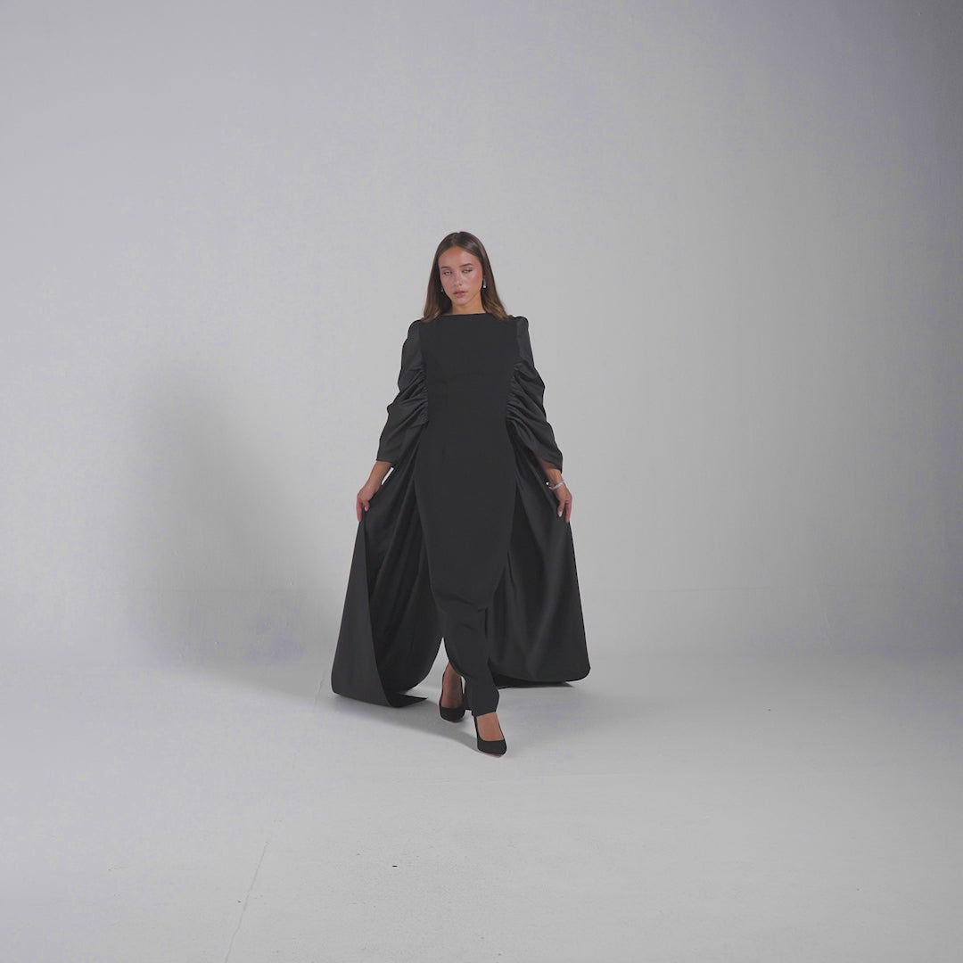 Elevate your evening wardrobe with this striking black crepe-taffeta gown, where refined elegance meets dramatic flair. The luxurious blend of crepe and taffeta fabrics creates a sophisticated silhouette with graceful movement, while the flowing back shawl adds an enchanting layer of drama and dimension. Perfect for formal occasions, galas, and upscale events, this timeless piece exudes understated luxury and contemporary style. The interplay of textures ensures you'll command attention with effortless grace.