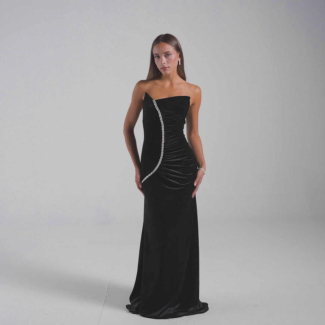 Elevate your evening elegance with this Black Velvet One Shoulder Fitted Maxi Dress. Crafted from sumptuous velvet, it contours the body seamlessly, highlighting your silhouette with a refined, flattering fit. The asymmetrical one-shoulder design adds a modern touch of sophistication, making it perfect for formal events or upscale gatherings. Its floor-length cut ensures a graceful, timeless look that embodies understated luxury.