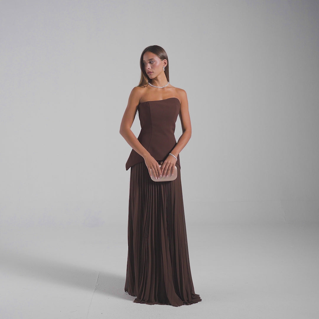 This elegant one-shoulder dress combines the rich texture of brown crepe with the light, flowing quality of chiffon. The pleated skirt adds graceful movement, creating a refined silhouette ideal for formal occasions. Its sophisticated design ensures you make a timeless statement with understated charm.