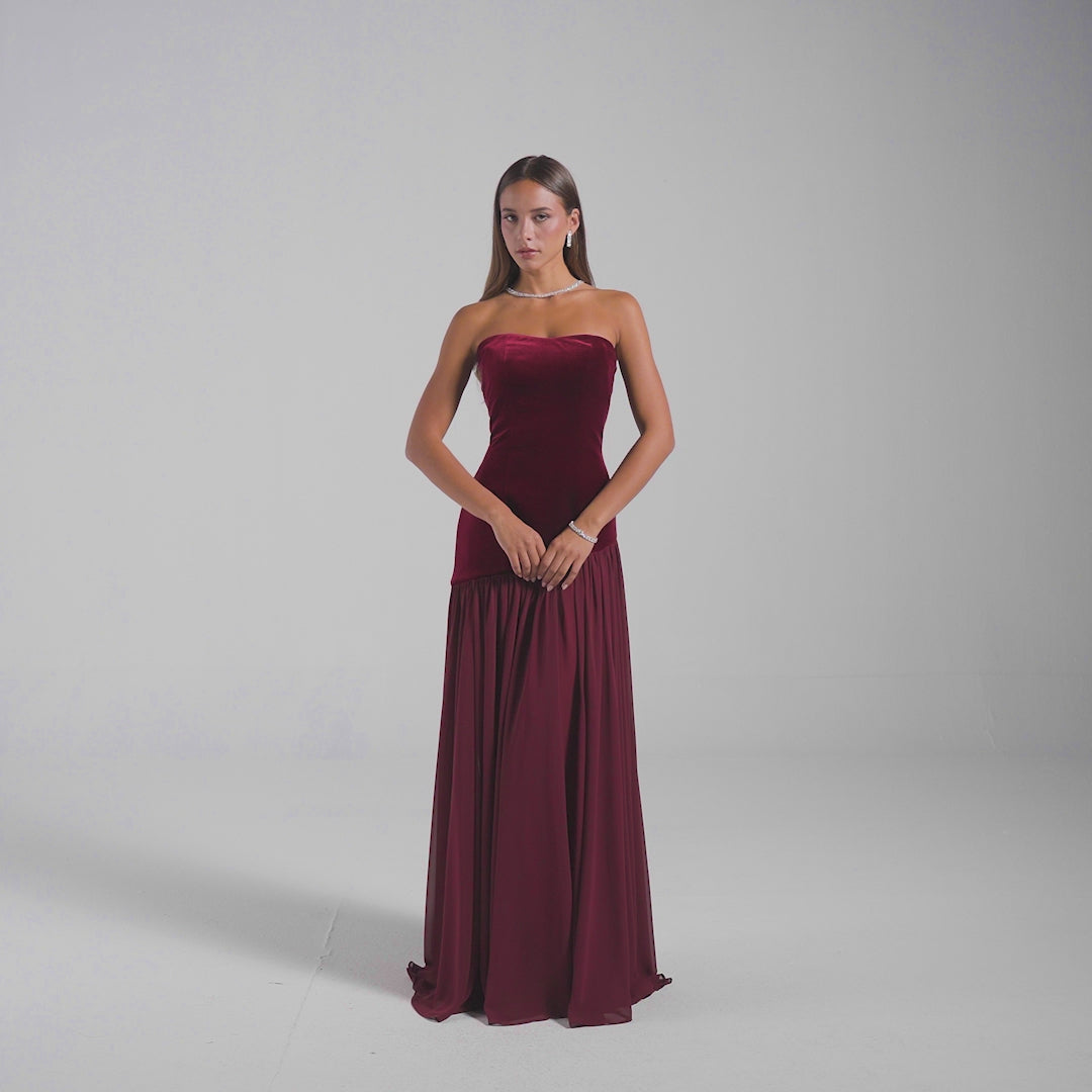 Burgundy Velvet Dress with Voluminous Chiffon Skirt