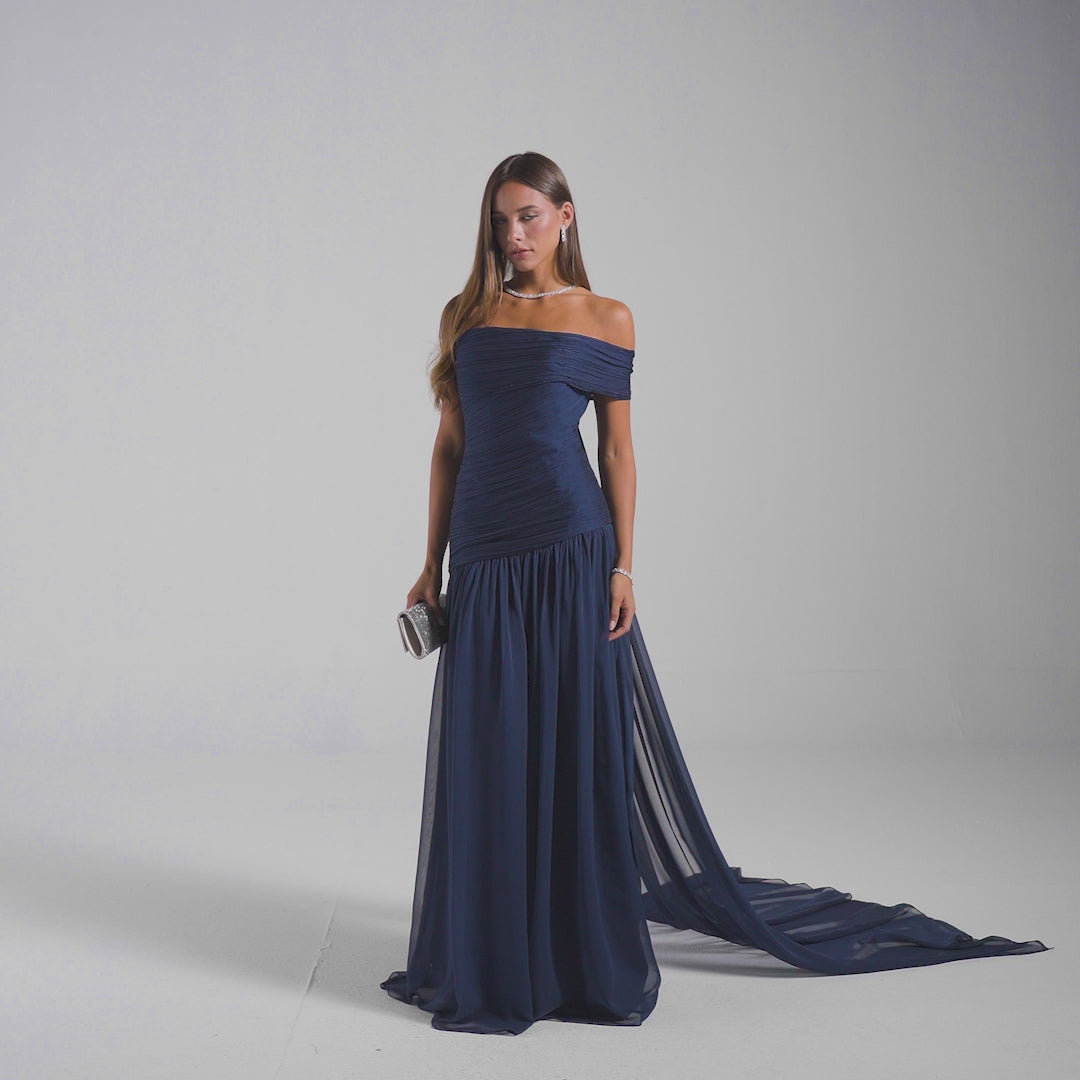 Elevate your evening wardrobe with this sophisticated navy chiffon gown, designed to captivate. The expertly ruched bodice creates a flattering silhouette while the flowing chiffon fabric drapes with effortless elegance. A striking back scarf adds an unexpected dramatic element, transforming this piece into a statement-making ensemble perfect for galas, weddings, and formal occasions. The combination of refined tailoring and graceful movement ensures you'll command attention with understated luxury.