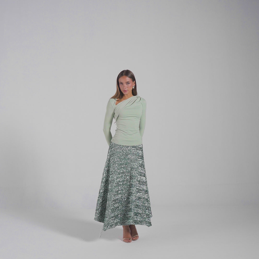 تنورة ترتر خضراء واسعة بقصة A تضيف لمسة من البريق الجذاب لإطلالتك. تتميز التنورة بقصة تبرز الخصر وتوفر حرية في الحركة. يمنحها لمعانها الناعم فخامة دون مبالغة، مما يجعلها خياراً مثالياً للمناسبات المسائية والاحتفالية.