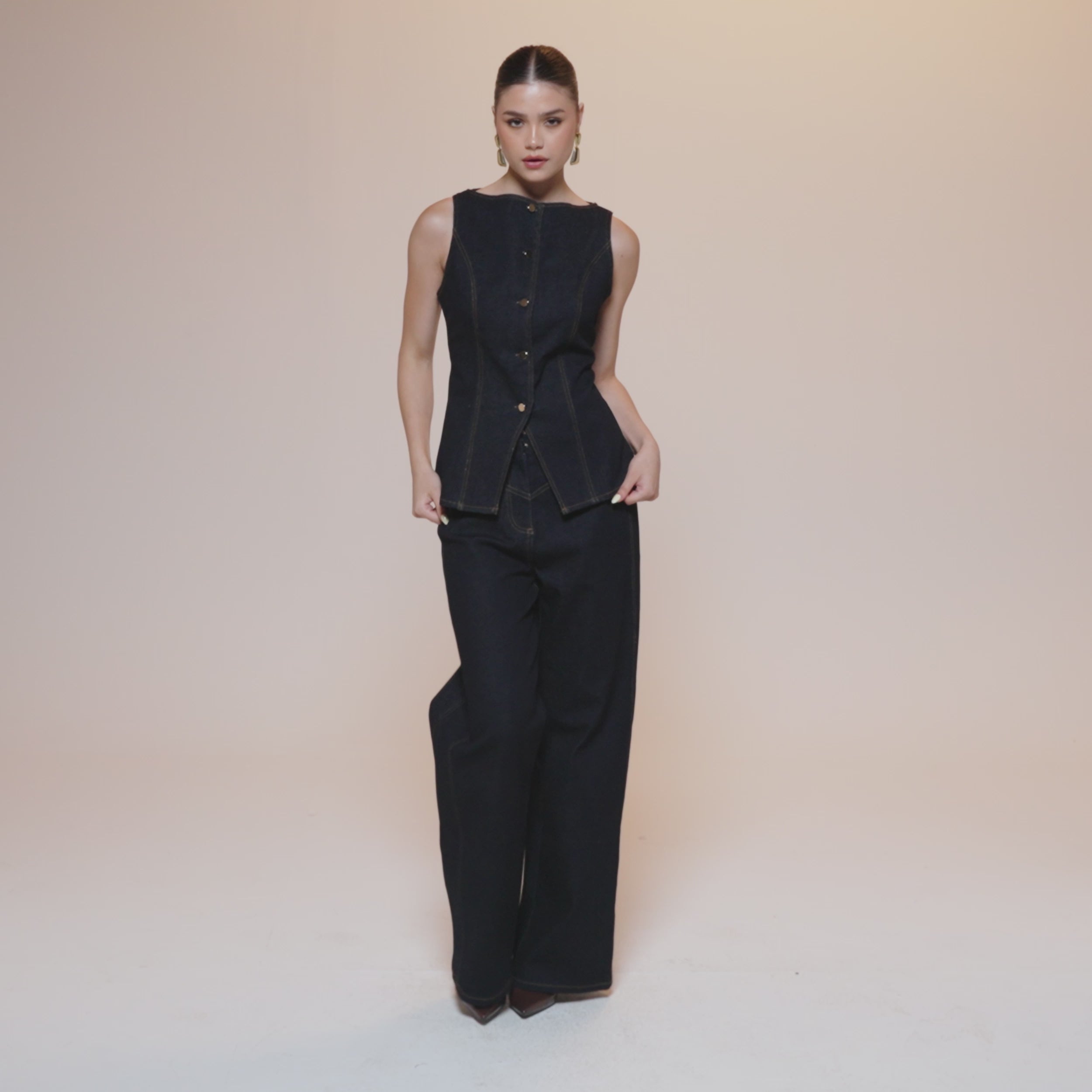 توب جينز بدون أكمام بأزرار أمامية من مجموعة صيف 2025. يتميز بقصة منحوتة، وأزرار مغطاة بالقماش، وخياطة بارزة تمنح التصميم طابعاً عصرياً بلمسة كلاسيكية.