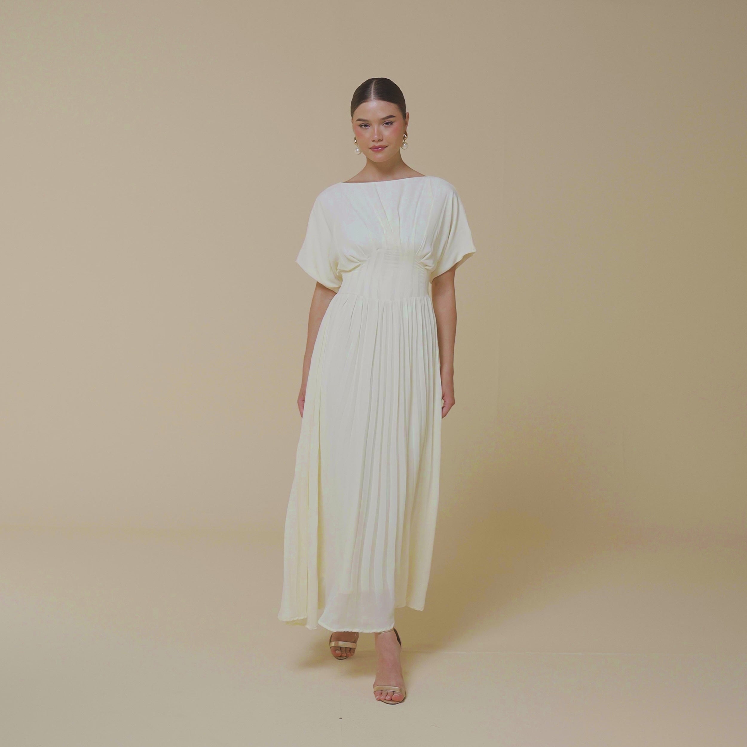 فستان عملي يناسب من تبحث عن إطلالة مريحة وأنيقة في آن واحد. يأتي بتنورة بليسيه انسيابية تضيف حركة خفيفة، بينما يبرز الخصر الضيق القوام بشكل يجمّله. تضيف الأكمام القصيرة المنسدلة لمسة ناعمة وتوفر تغطية مريحة، مما يجعله خيارًا مثاليًا للزيارات أو الجمعات العائلية.