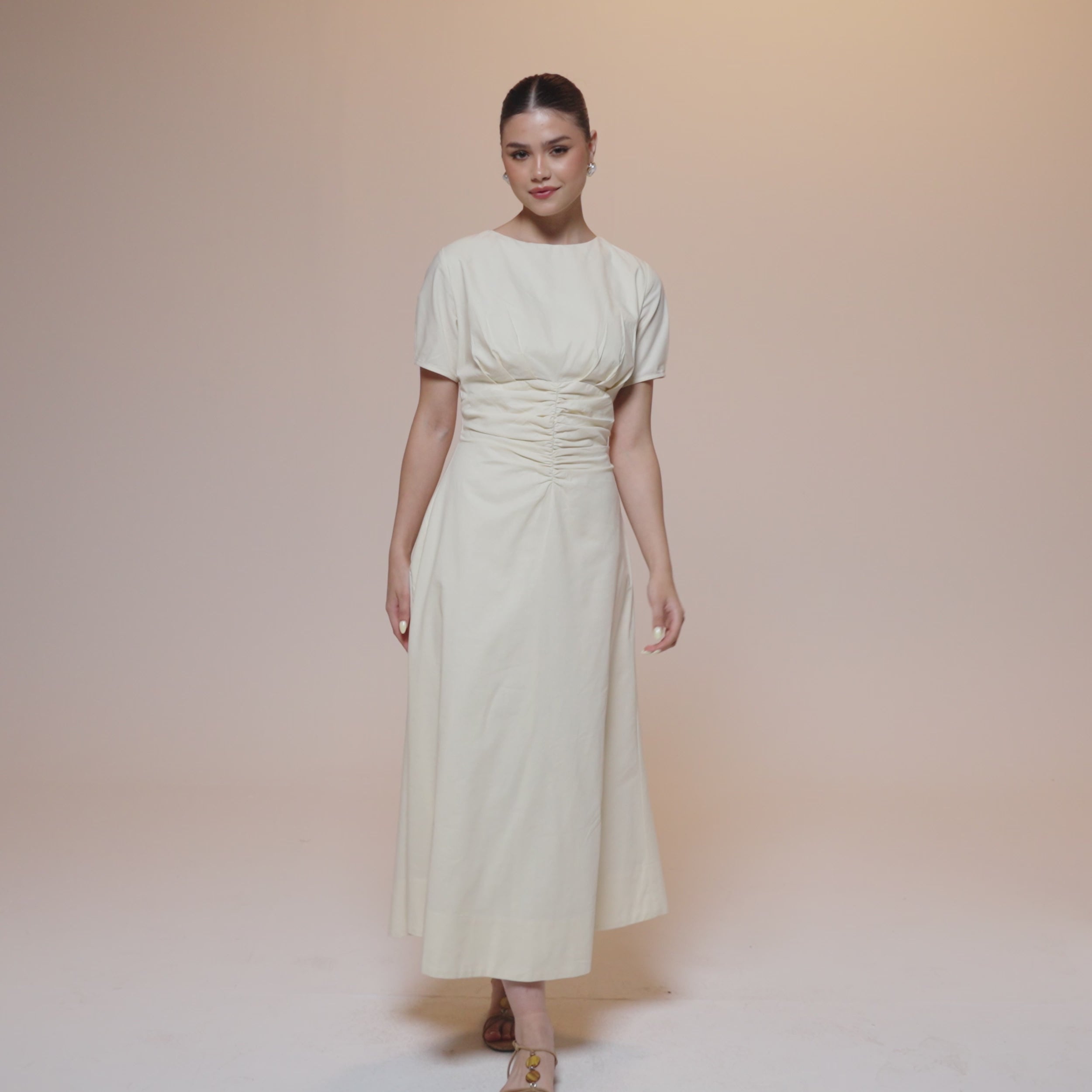 فستان ميدي بخصر مزموم وأكمام قصيرة من مجموعة صيف 2025. يتميز هذا الفستان المصنوع من كتان مخلوط خفيف بزمة أمامية ناعمة وياقة دائرية وتنورة واسعة تمنحك راحة وأناقة تدوم طوال اليوم.