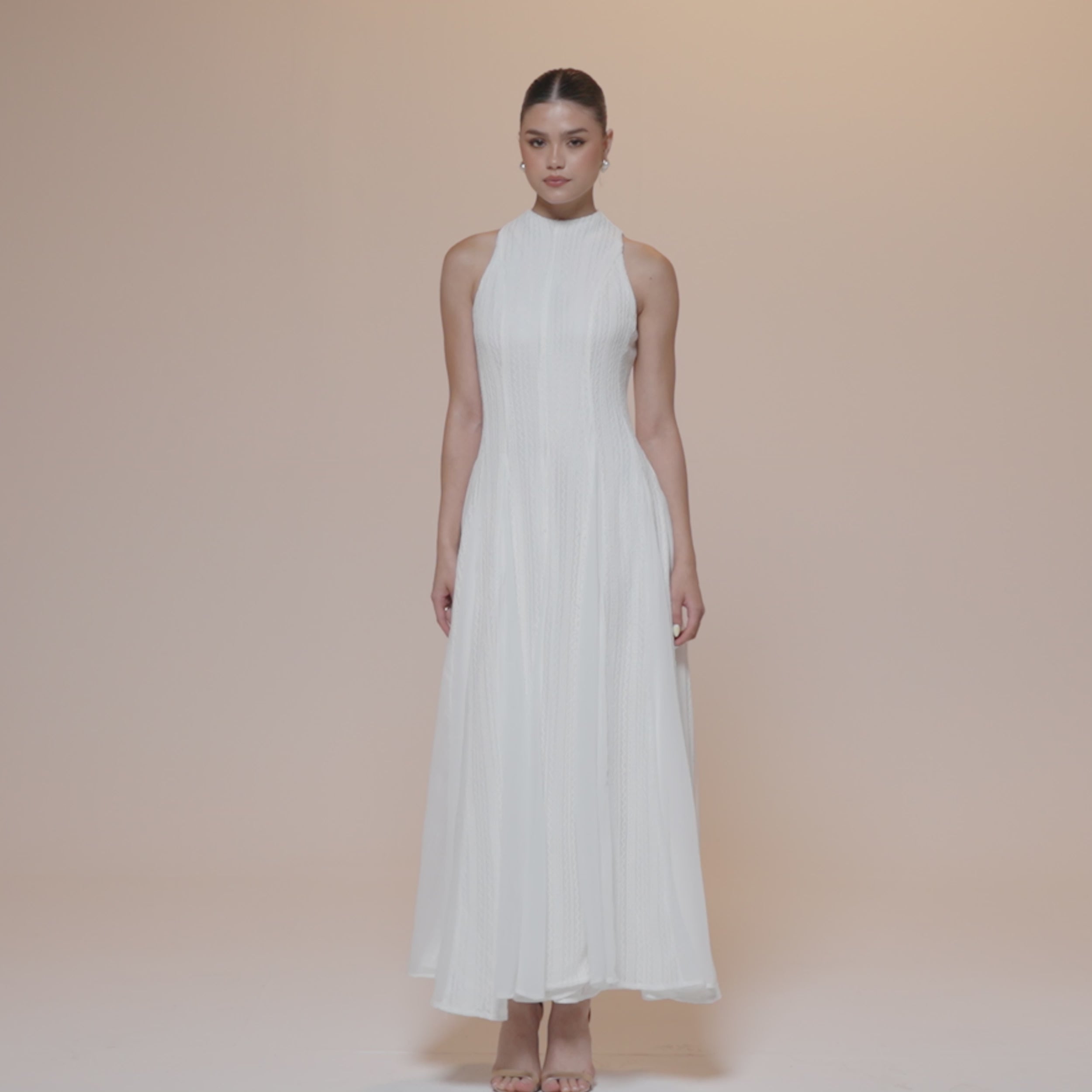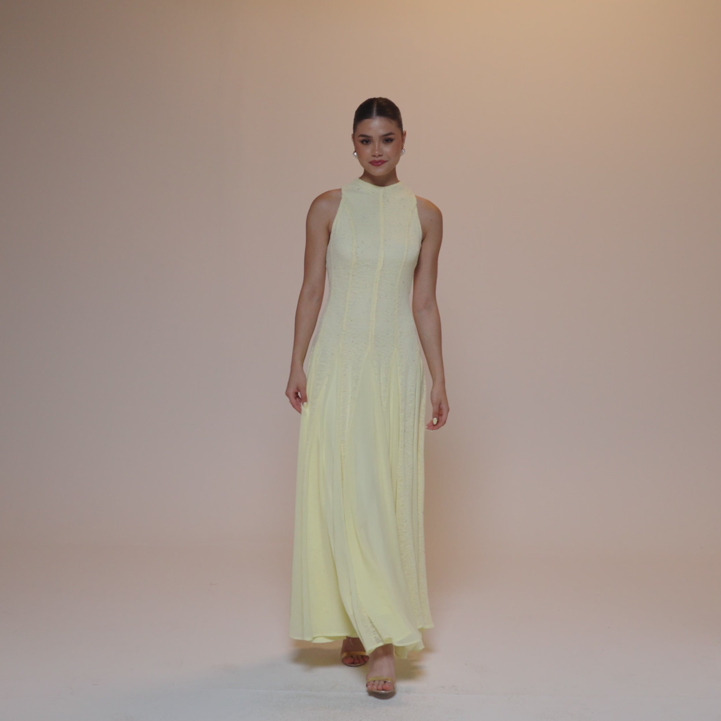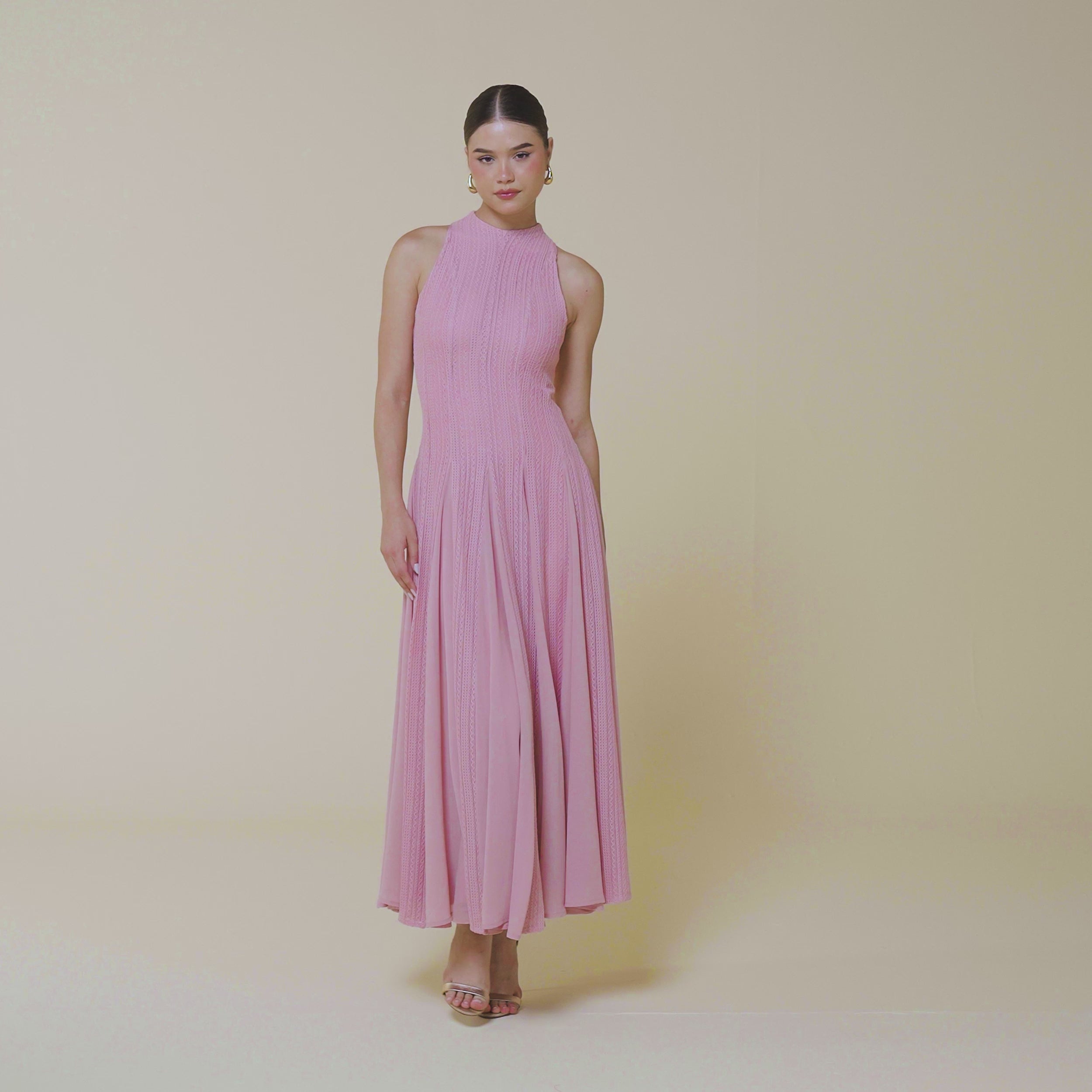 فستان ماكسي بدون أكمام يناسب الأيام اللي تحتاجين فيها توازن بين الشكل المرتب والراحة. يحدد الجزء العلوي من القماش المحبوك القوام بلطف، بينما تضيف إدخالات الشيفون في التنورة حركة خفيفة ولمسة أنثوية مع كل خطوة.