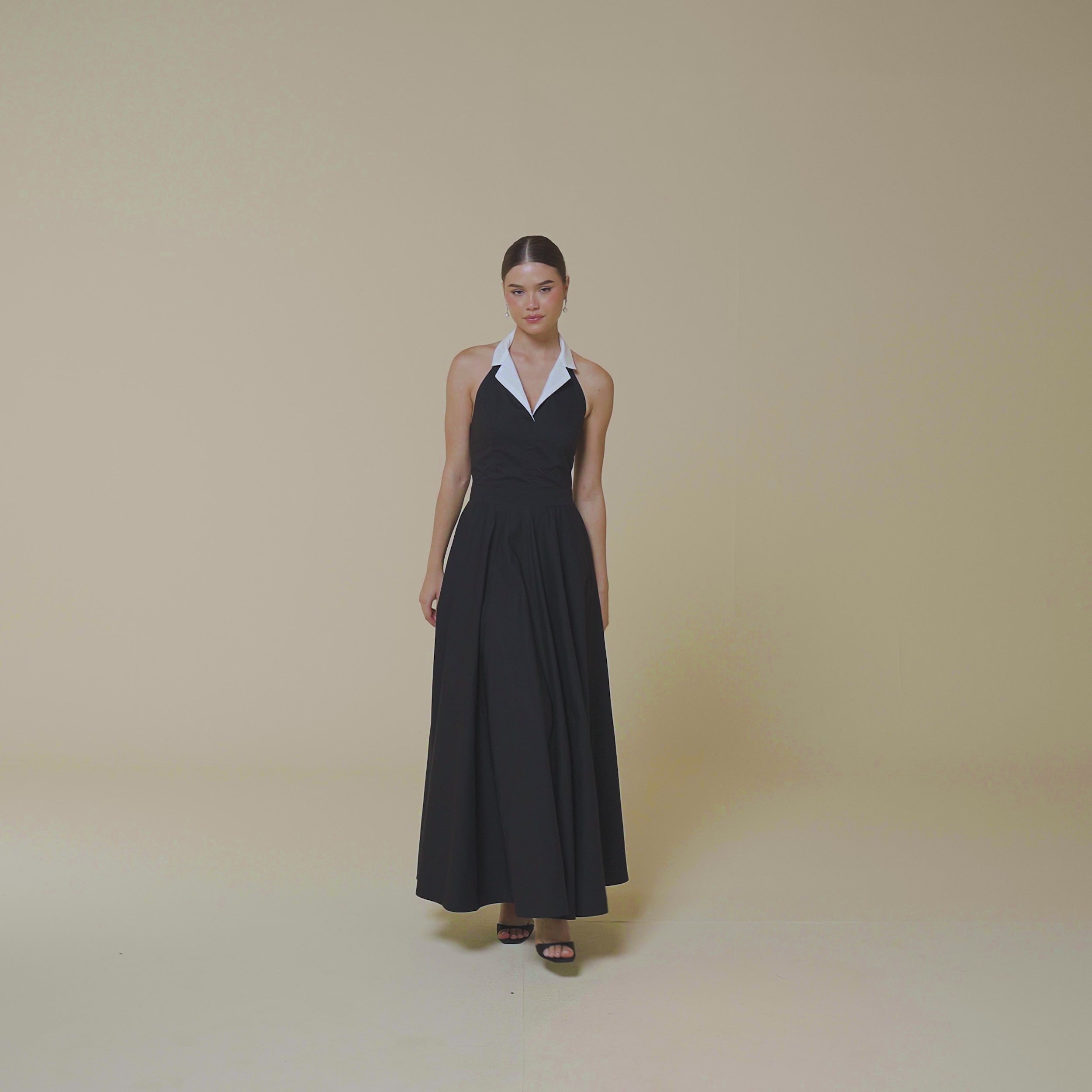 فستان ماكسي أسود بياقة بيضاء من مجموعة صيف الينا 2025. يتميز بياقة متباينة بلون أبيض، صدر ضيق، وتنورة واسعة بقصة A. يأتي الفستان بتصميم ظهر مكشوف مع أستيك لراحة أكبر.