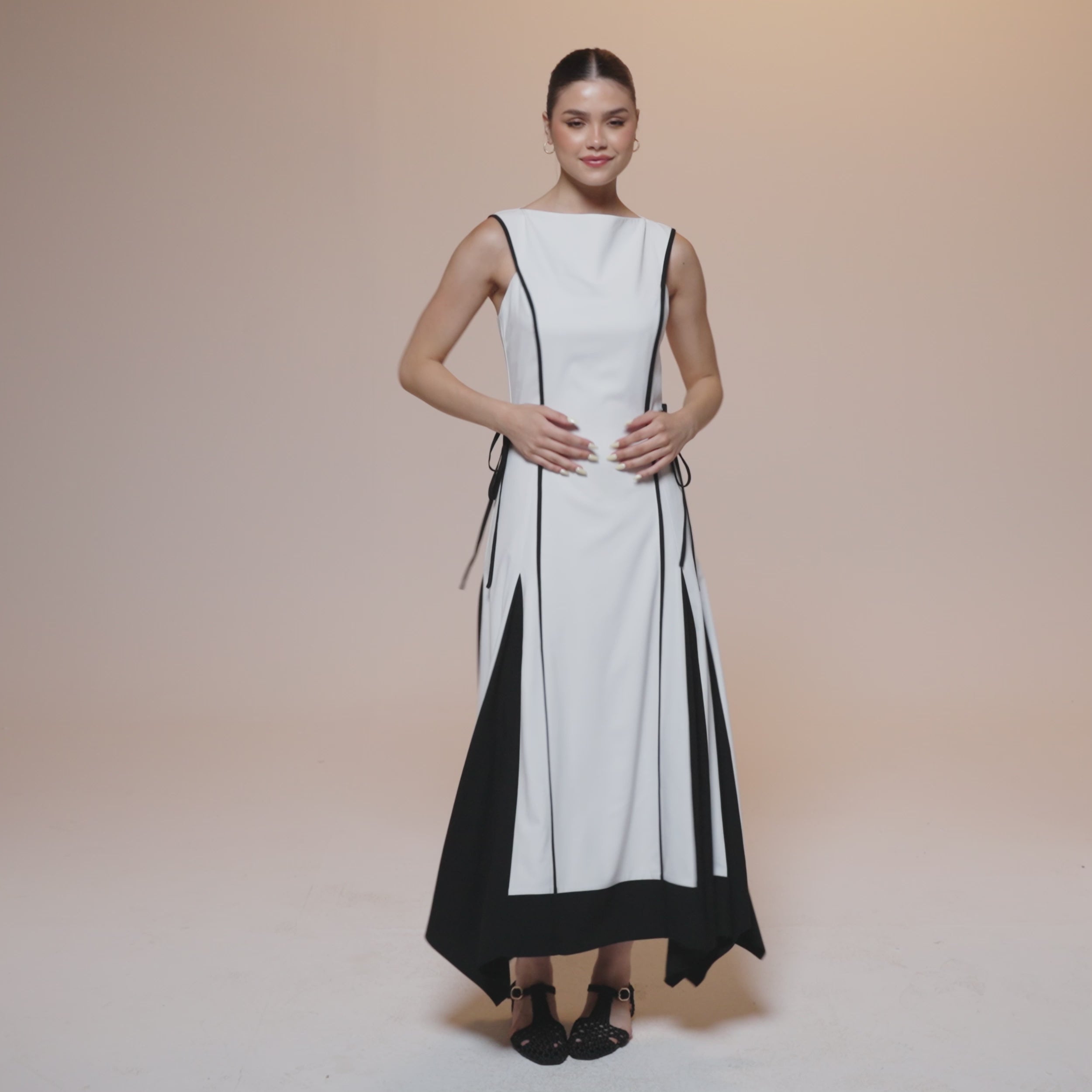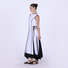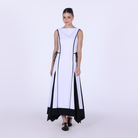 فستان بدون أكمام بتفاصيل متباينة من مجموعة صيف 2025. يتميز هذا الفستان، المصنوع من كريب انسيابي بالأبيض والأسود، بتوسيعات جوديه سوداء، وربطات جانبية ناعمة، وتصميم يمنحك حركة أنثوية أنيقة.