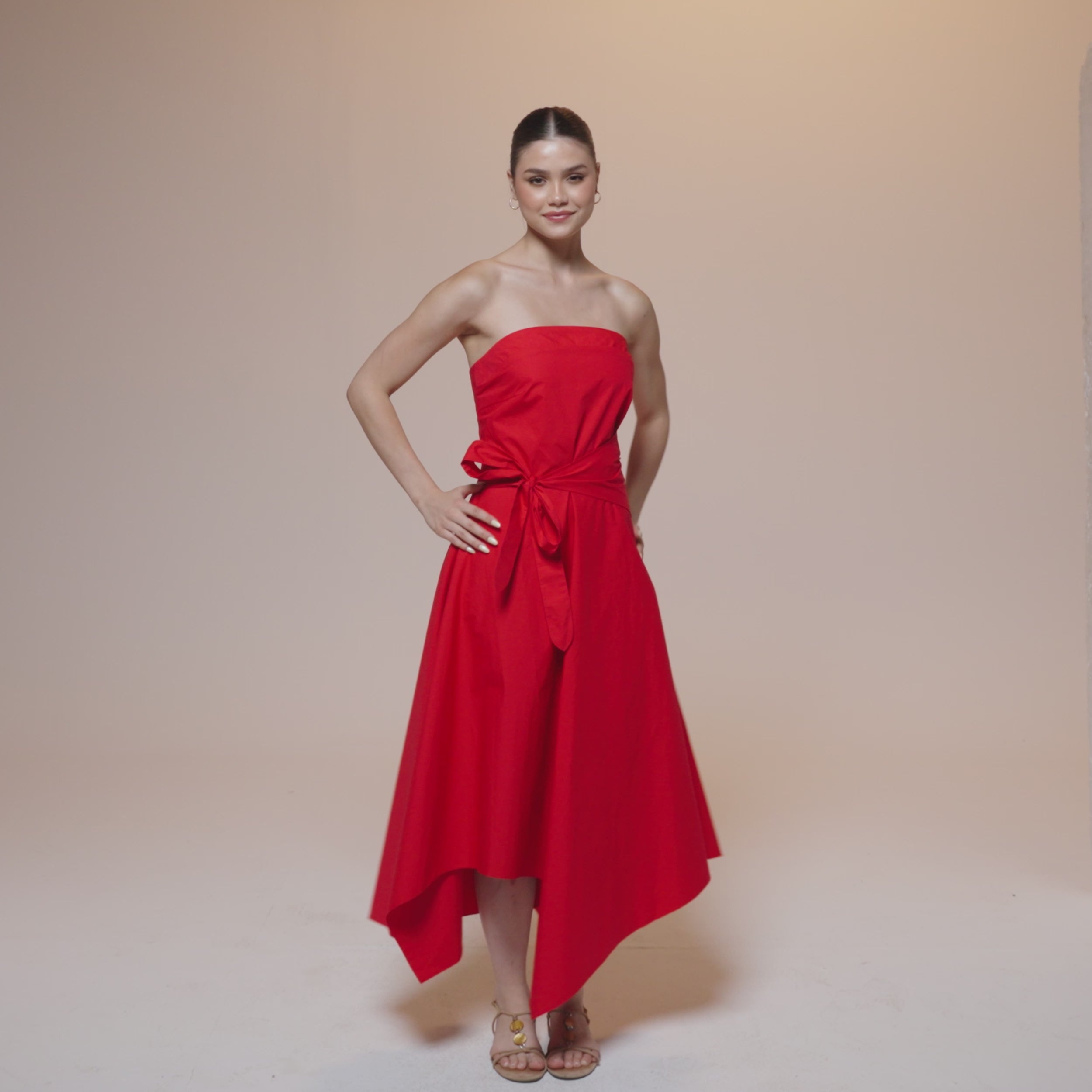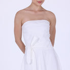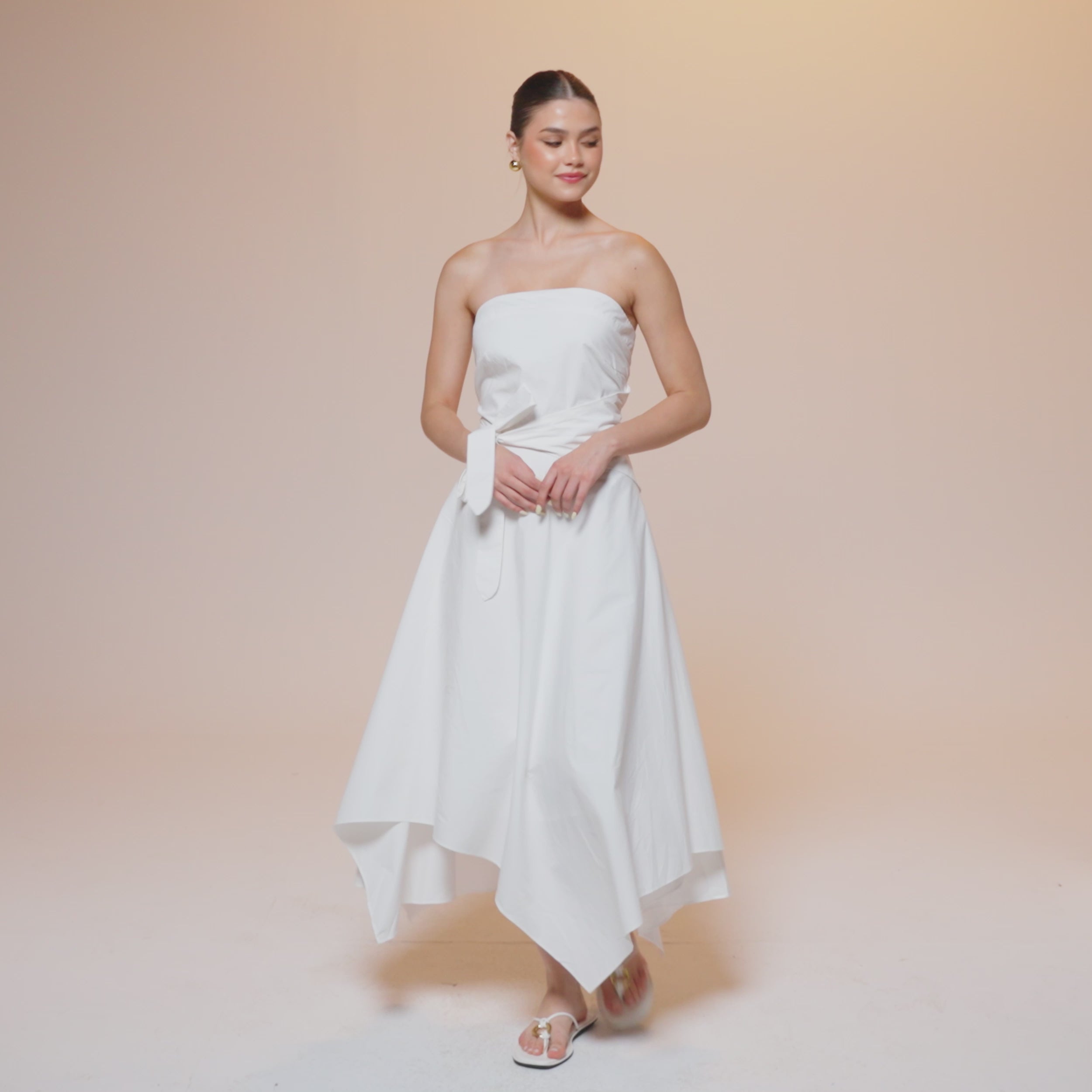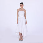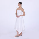 فستان ميدي بكتف واحد من قماش قطن بوبلين من مجموعة صيف 2025. يتميّز بياقة ملتفة، وتنورة غير متماثلة، وربطة ناعمة عند الكتف وأخرى عند الخصر، مع خياطة عند الخصر تبرز القوام بانسيابية.