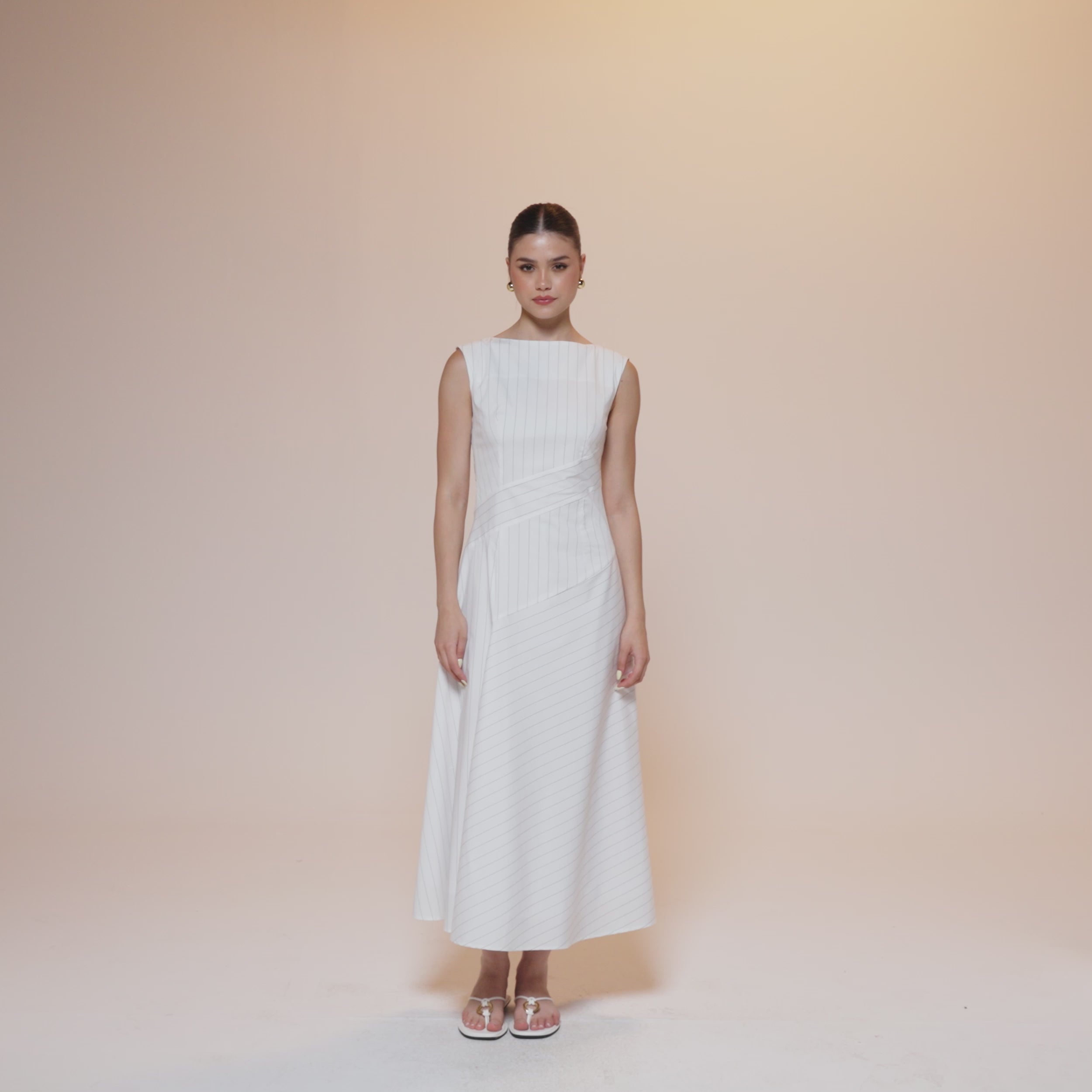فستان ميدي قطن مخلوط مخطط من مجموعة صيف 2025. يتميّز هذا الفستان المصنوع من قطن مخلوط خفيف بياقة دائرية وقصة A انسيابية مع سحاب جانبي لإغلاق مريح ولمسة نهائية أنيقة.