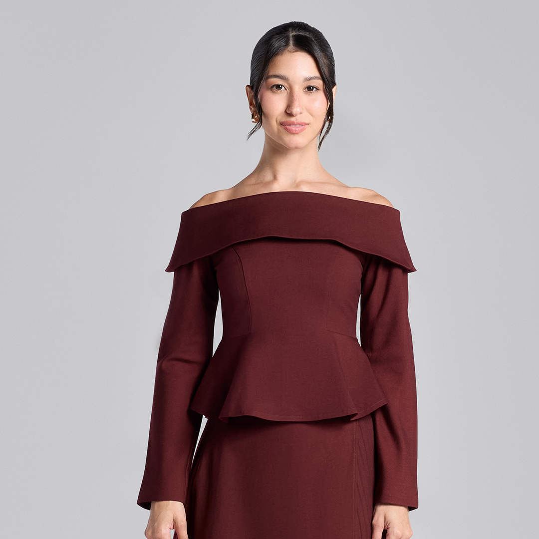توب برغندي صوف بكتف مكشوف وقصة بيبلوم