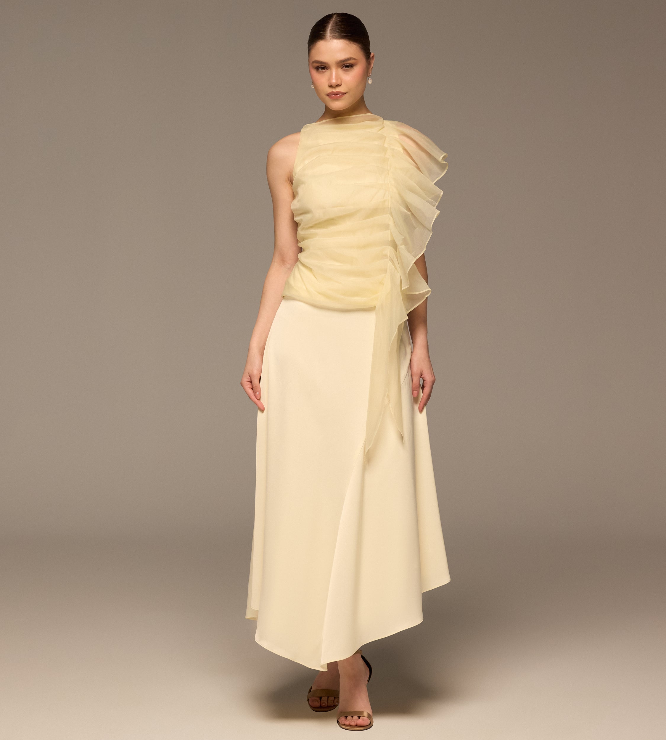 بلوزة أصفر فاتح أورجانزا بكشكش على جانب واحد