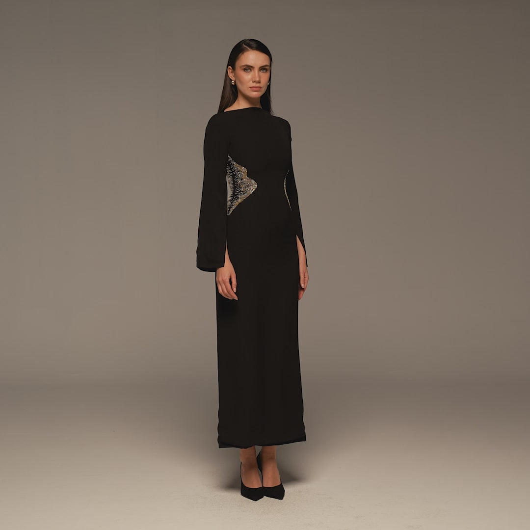 فستان أسود ماكسي كريب بتطريز ذهبي