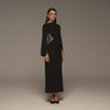 فستان أسود ماكسي كريب يمنحكِ إطلالة جذابة ومريحة. يبرز التطريز الذهبي الخصر بشكل ناعم ولافت، بينما تمنحك الأكمام الطويلة تغطية راقية تناسب السهرات والمناسبات العائلية.