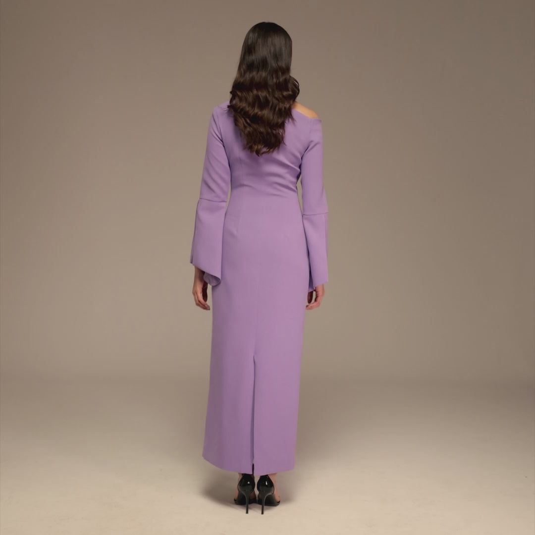 فستان ميدي كريب بتصميم قائم على التباين. يأتي بأكمام طويلة بحواف واسعة توازن القصّة، أحدهما مكشوف والآخر مزين بدرابيه ناعم. تمنح التنورة بقصة A-Line أنوثة وأناقة وسهولة في حركة.