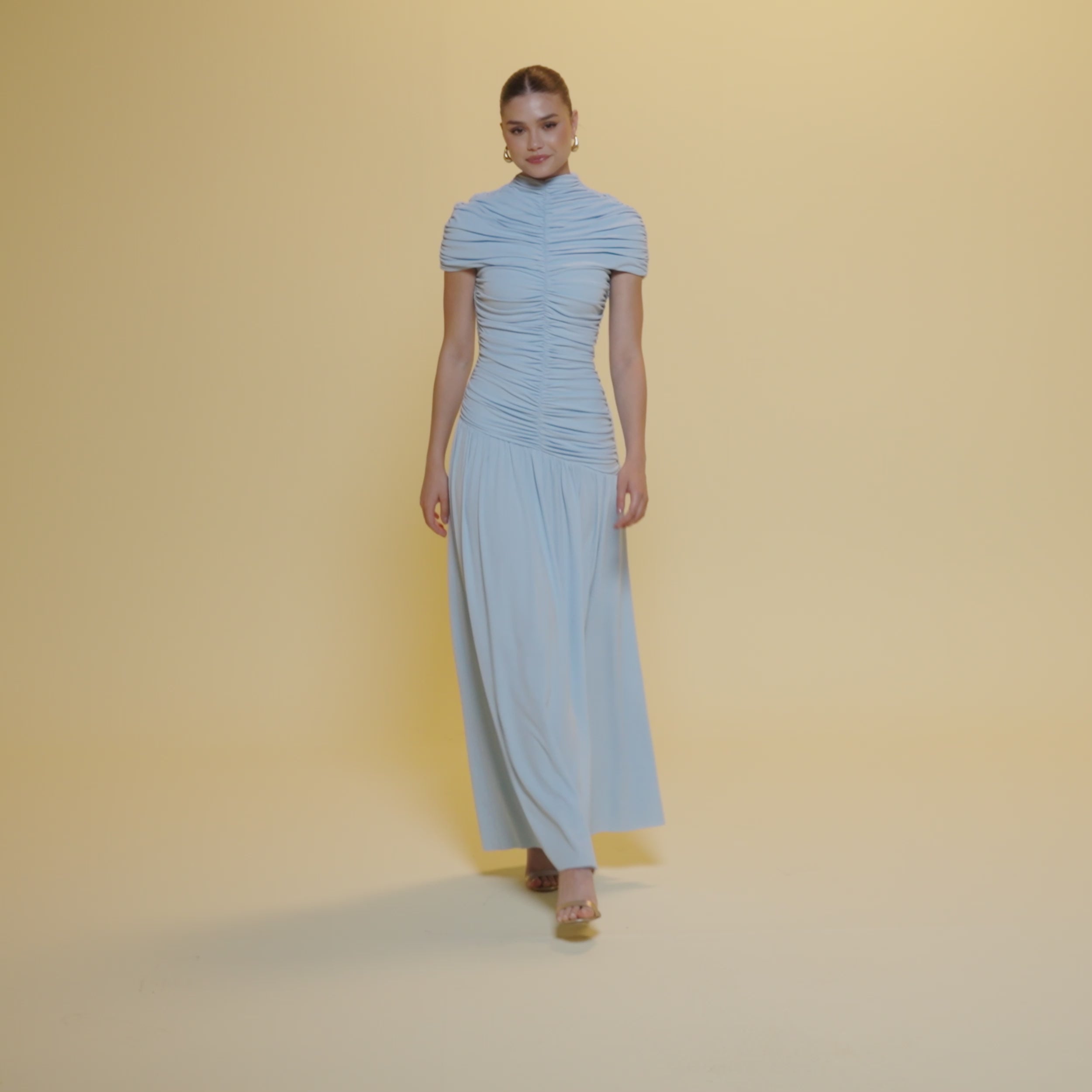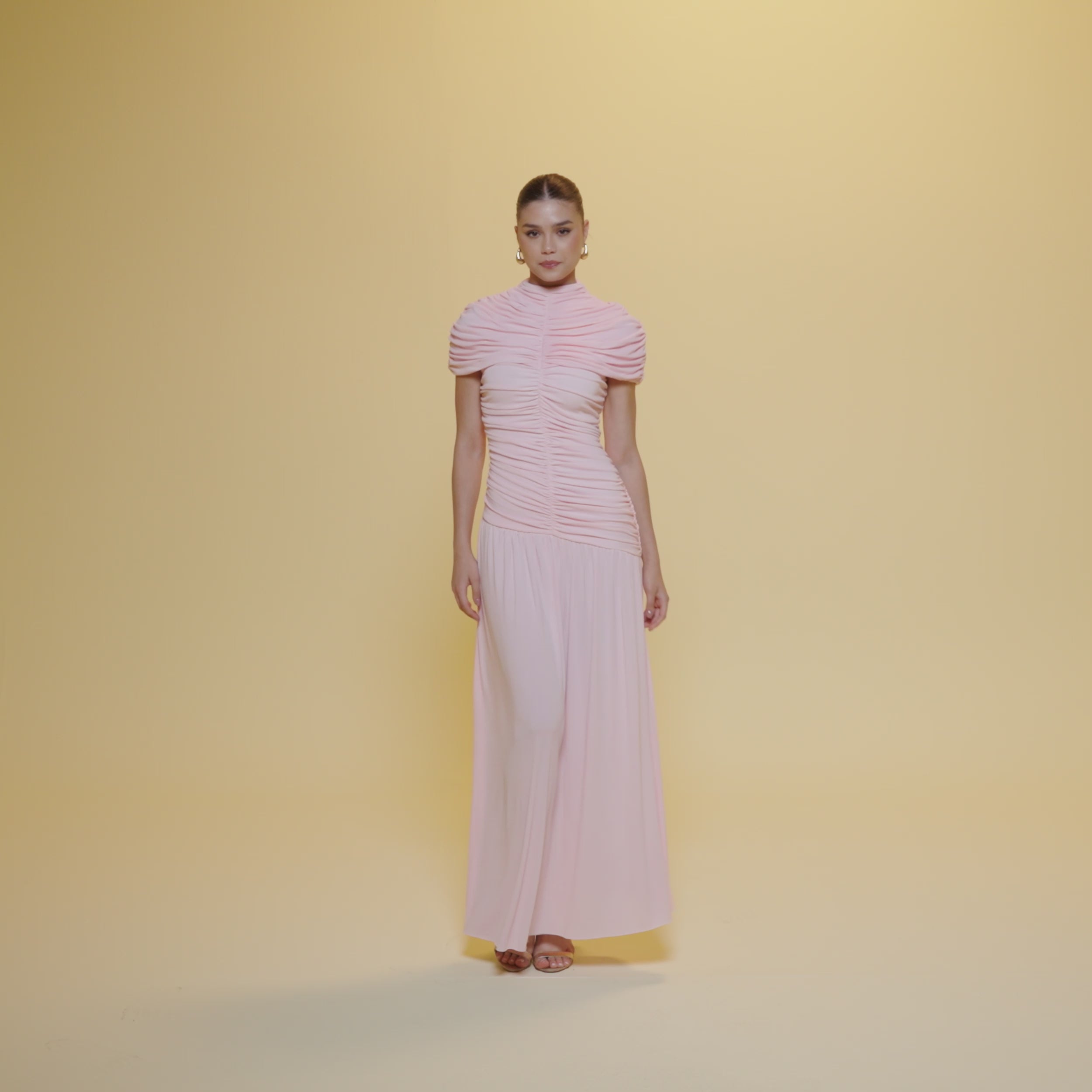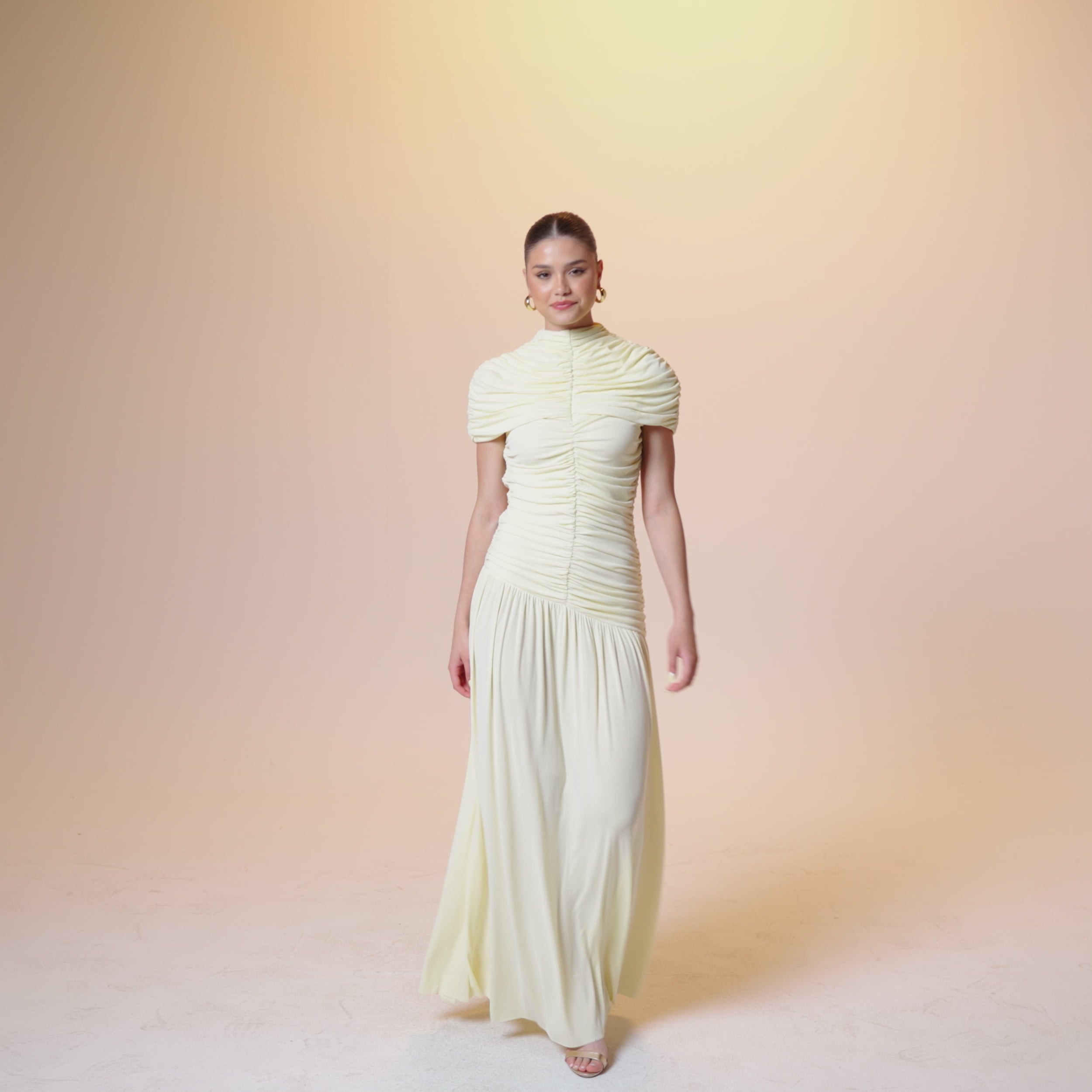 قصة ترسم القوام براحة وبدون تقييد. فستان ماكسي جيرسي بثنيات ناعمة حول الياقة والكتفين والصدر تضيف شكلاً انسيابيًا من دون ضيق. يأتي بتنورة بليسيه واسعة تضيف بعدًا بصريًا متباين الملمس. مناسب لإطلالات المساء التي تتطلب راحة وأناقة لافتة بدون مجهود.