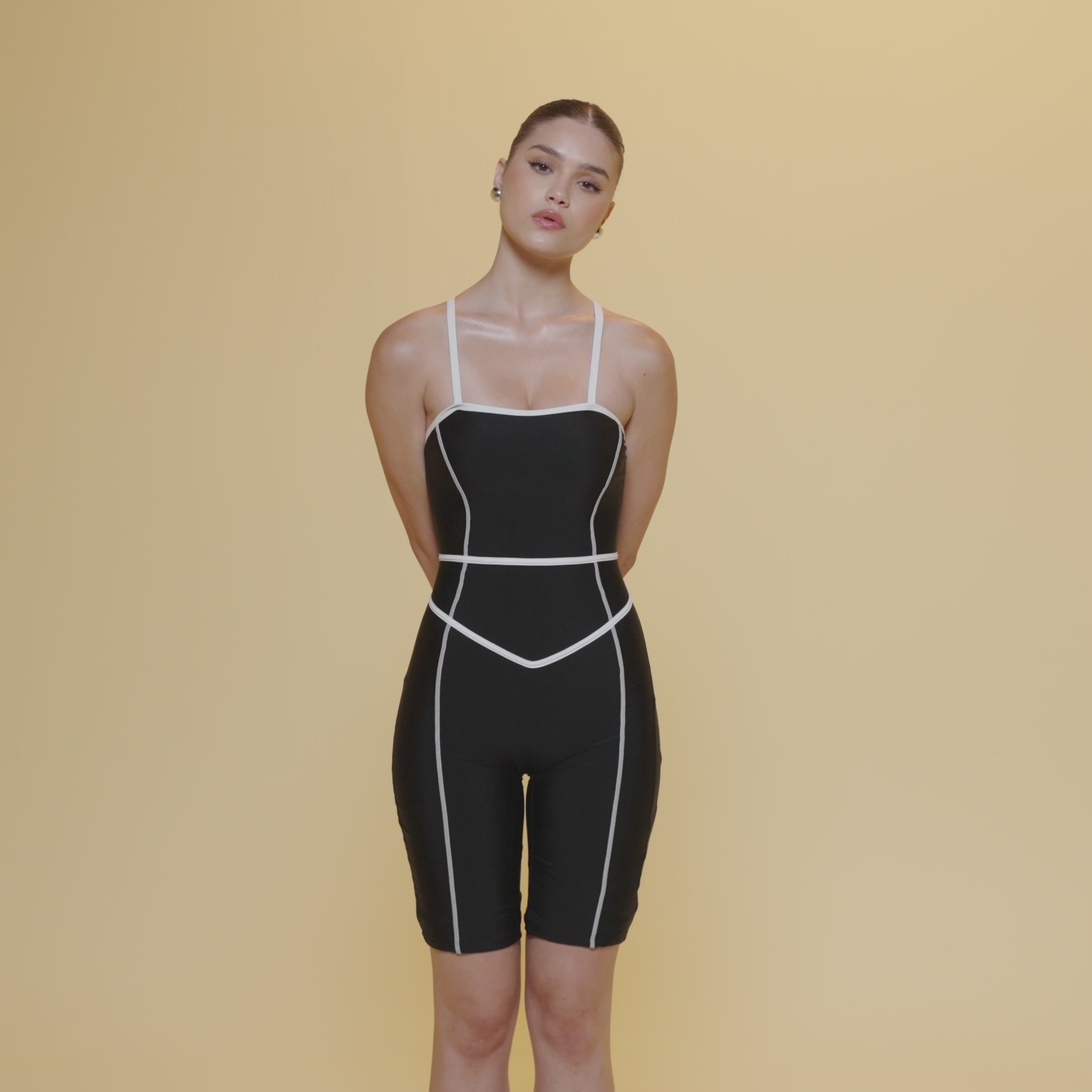 يتميز لباس السباحة هذا برقبة هالتر جذابة، مع حواف بيضاء تحدد لونه الأسود الأنيق. يكتمل التصميم بظهر مكشوف وأشرطة متقاطعة تضمن مقاساً آمناً ومريحاً. تصميم يجمع بين الراحة والأناقة البسيطة والتفاصيل العصرية.