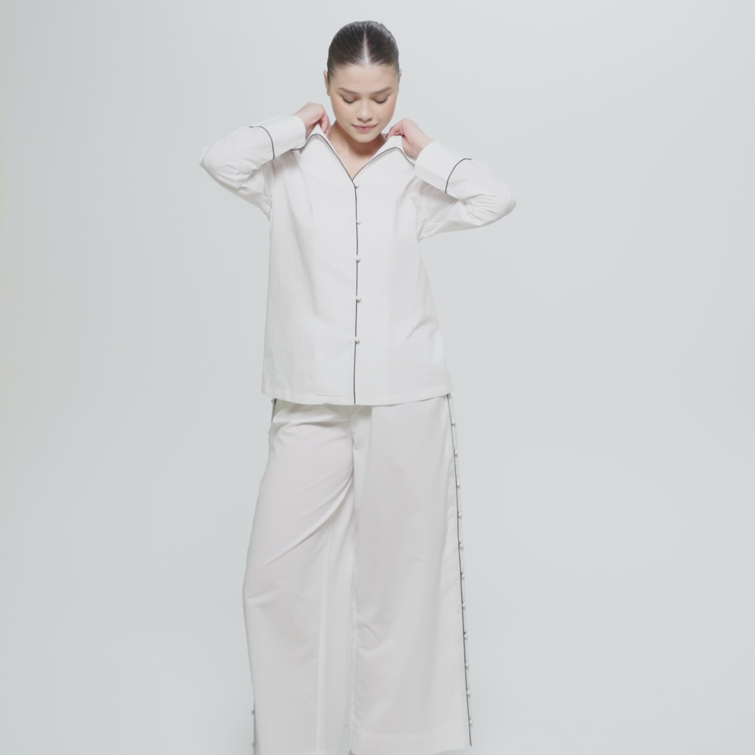 بنطلون قطن بأزرار جانبية وخصر مطاطي يجمع بين البساطة واللمسة العصرية. يتميز بفتحات جانبية مزينة بأزرار تضيف لمسة فريدة، مع خصر مطاطي لارتداء سهل ومريح، وقصته الواسعة تمنحك راحة مثالية لأوقات الاسترخاء.